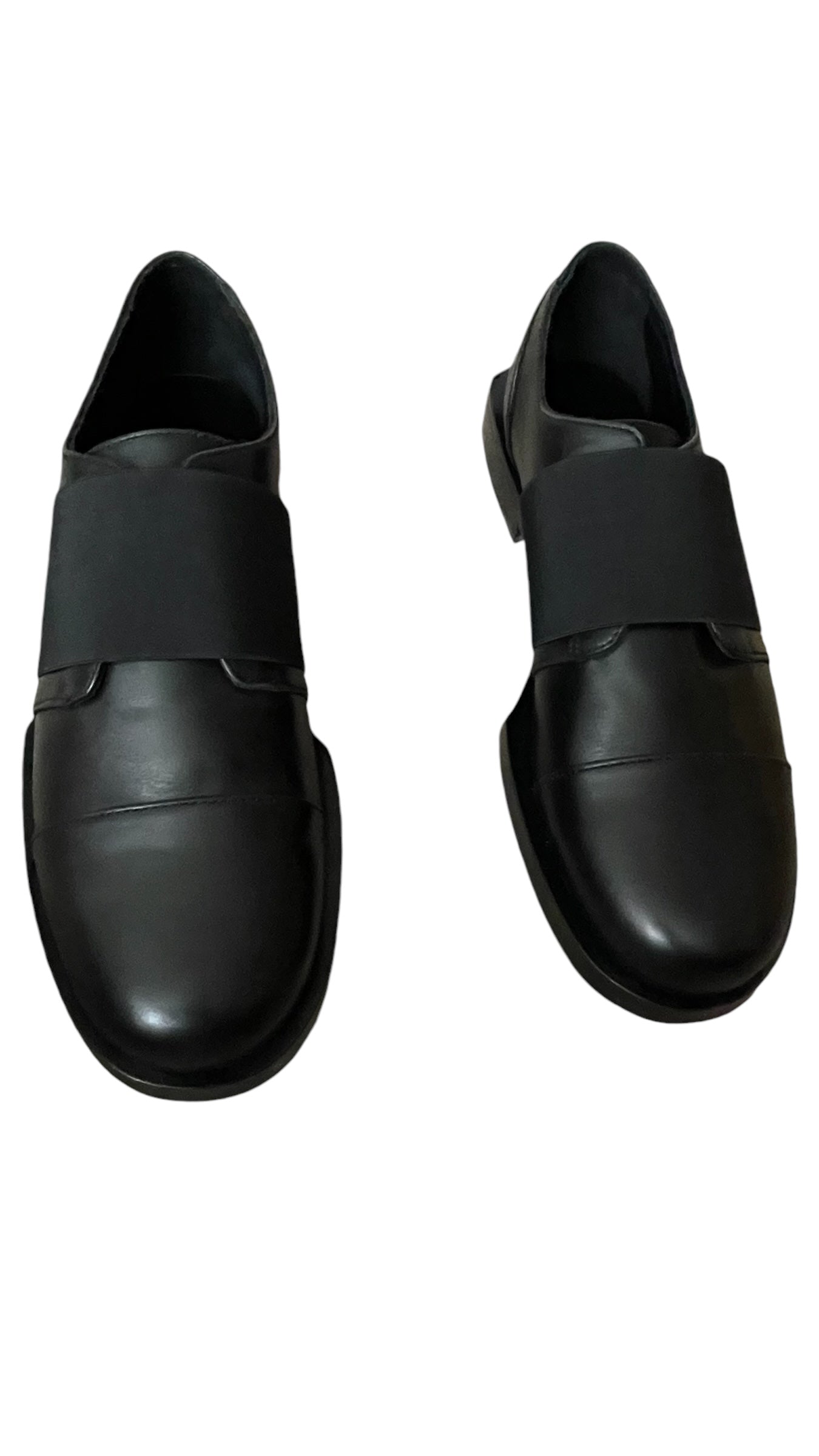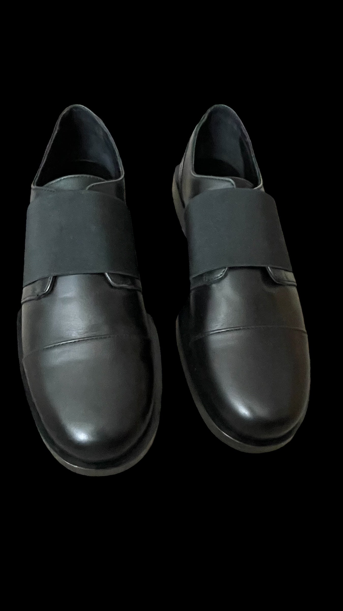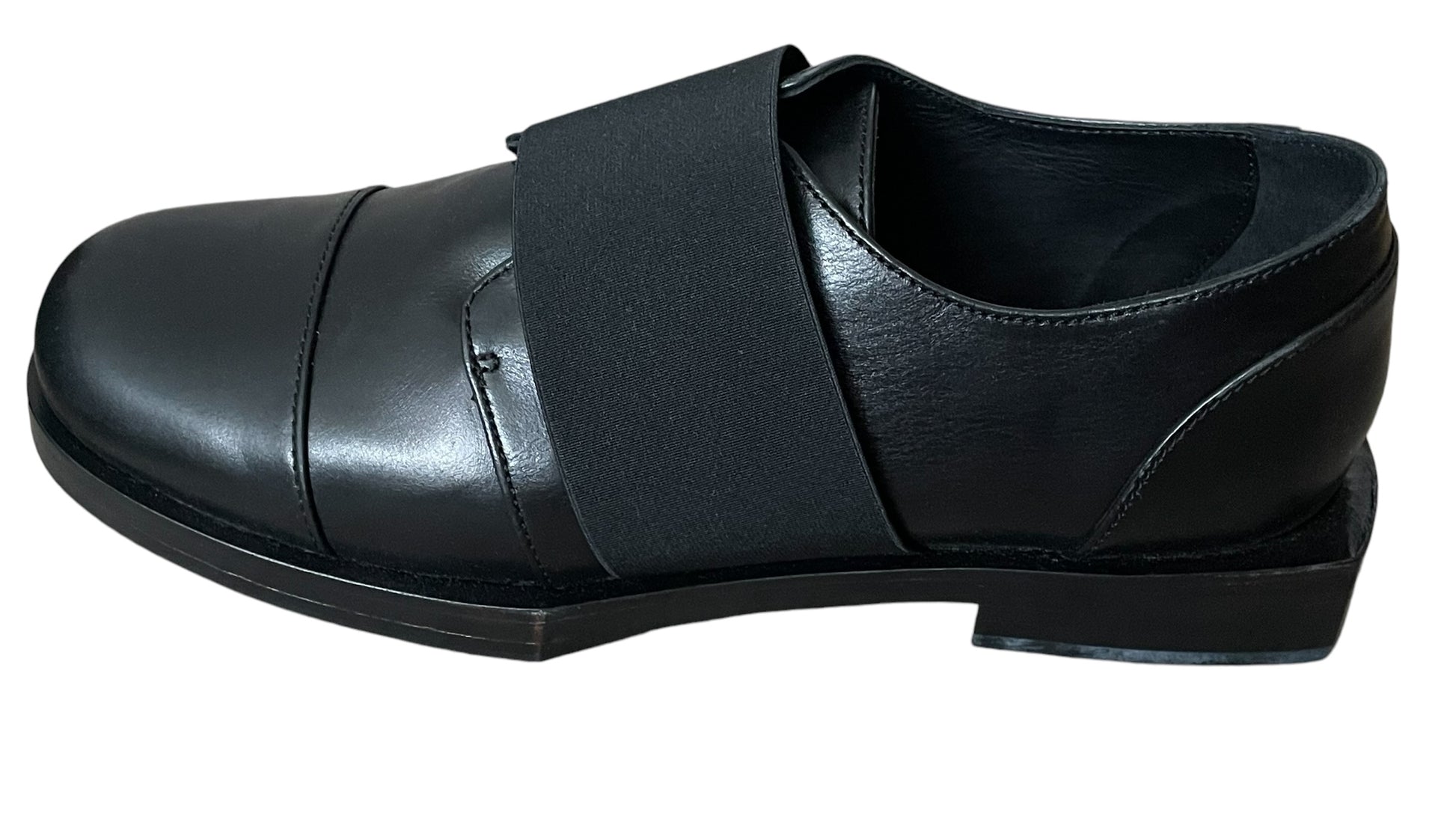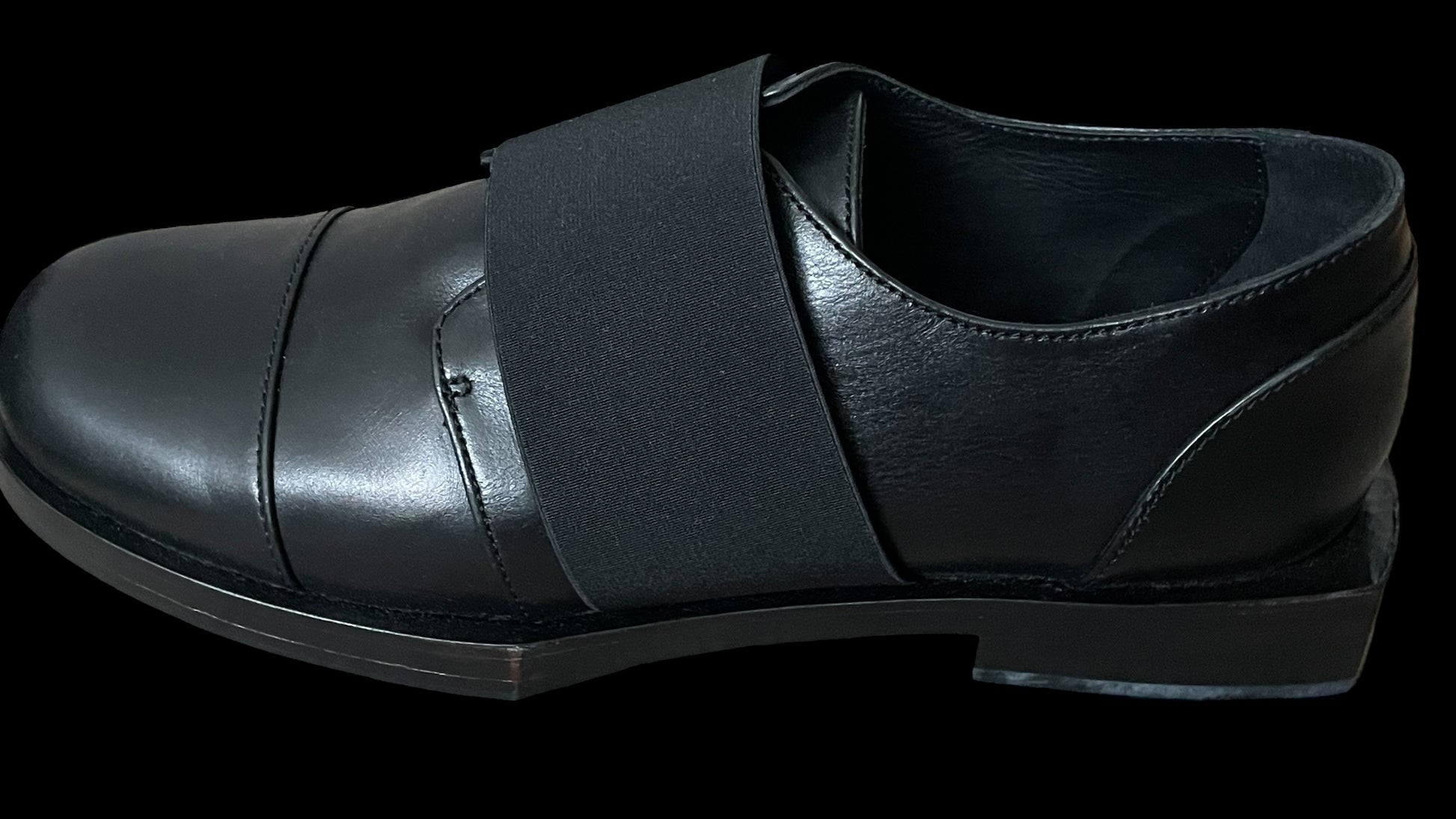 Men’s black cyclone leather slip on shoes by ACHILLES ION GABRIEL: wide thick elastic band top. Asymmetric sole. Leather and Rubber sole