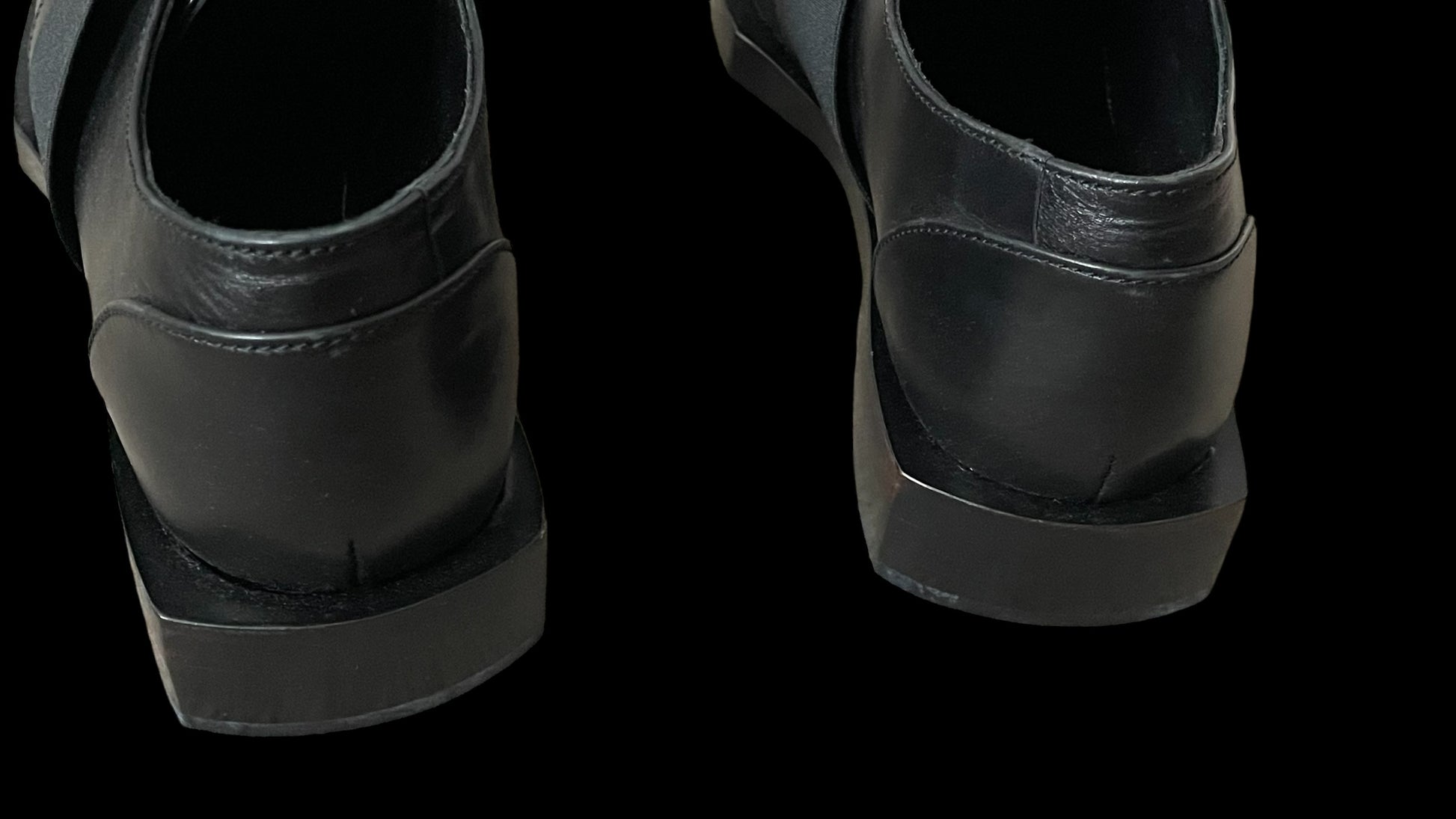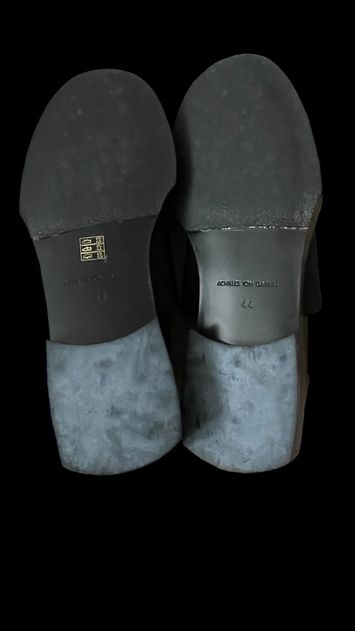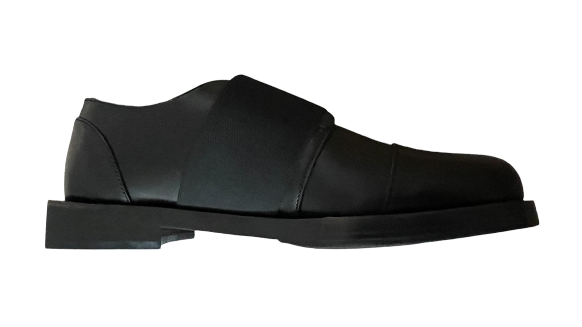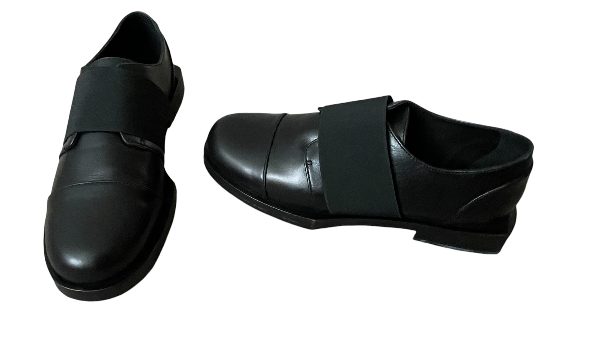 Men’s black cyclone leather slip on shoes by ACHILLES ION GABRIEL: wide thick elastic band top. Asymmetric sole. Leather and Rubber sole