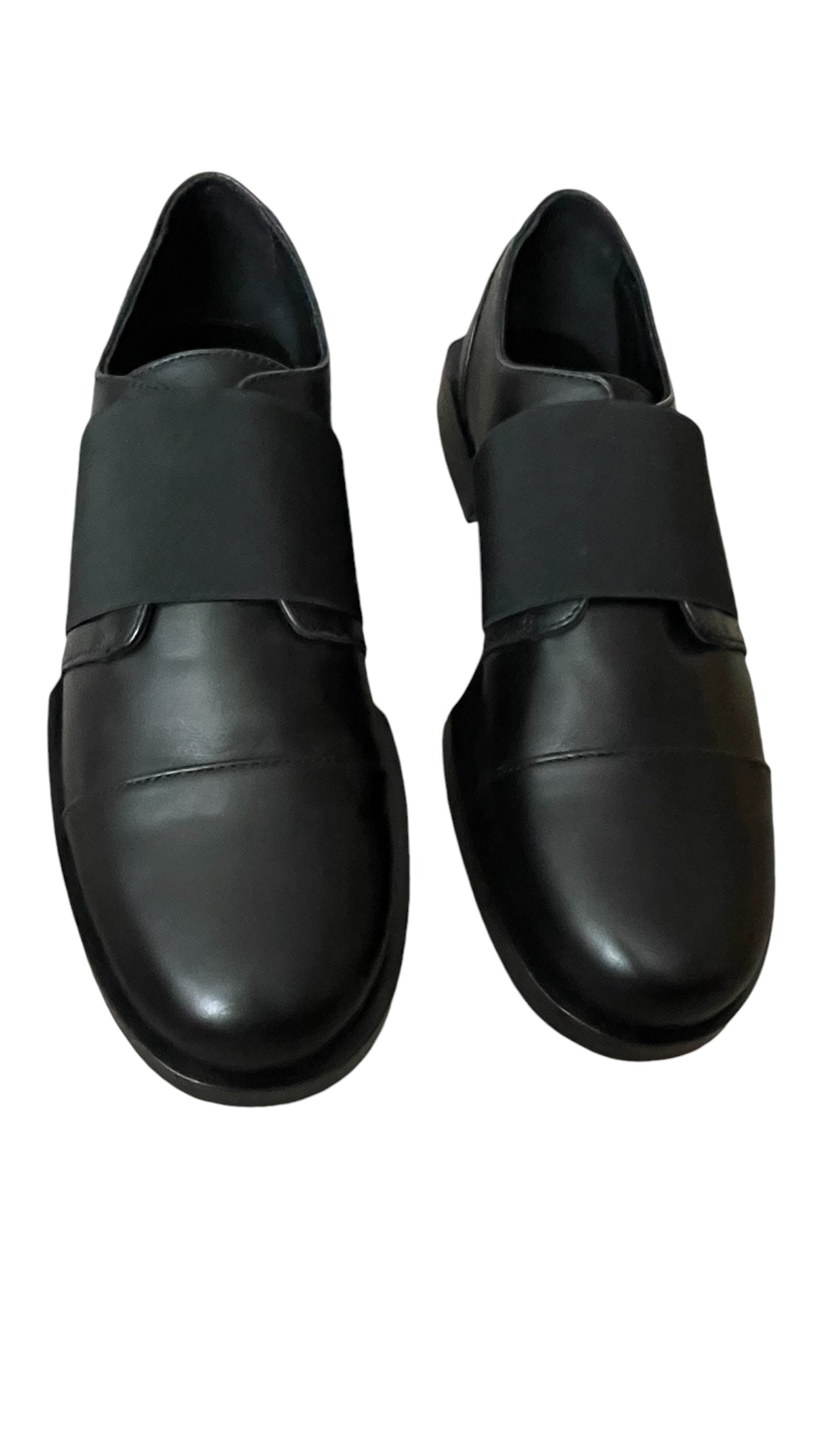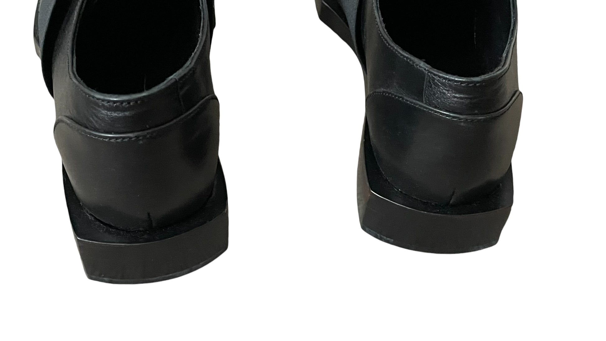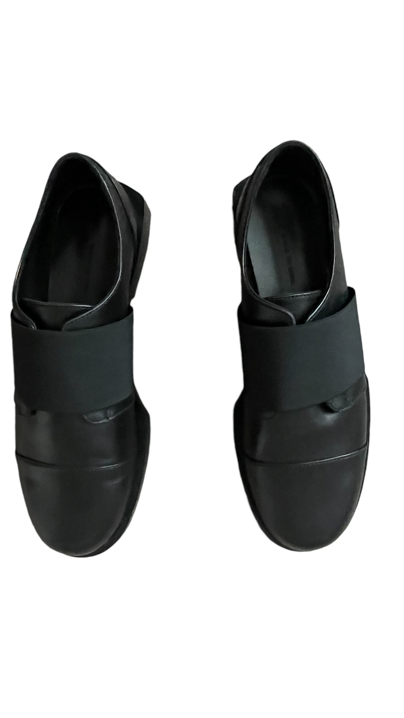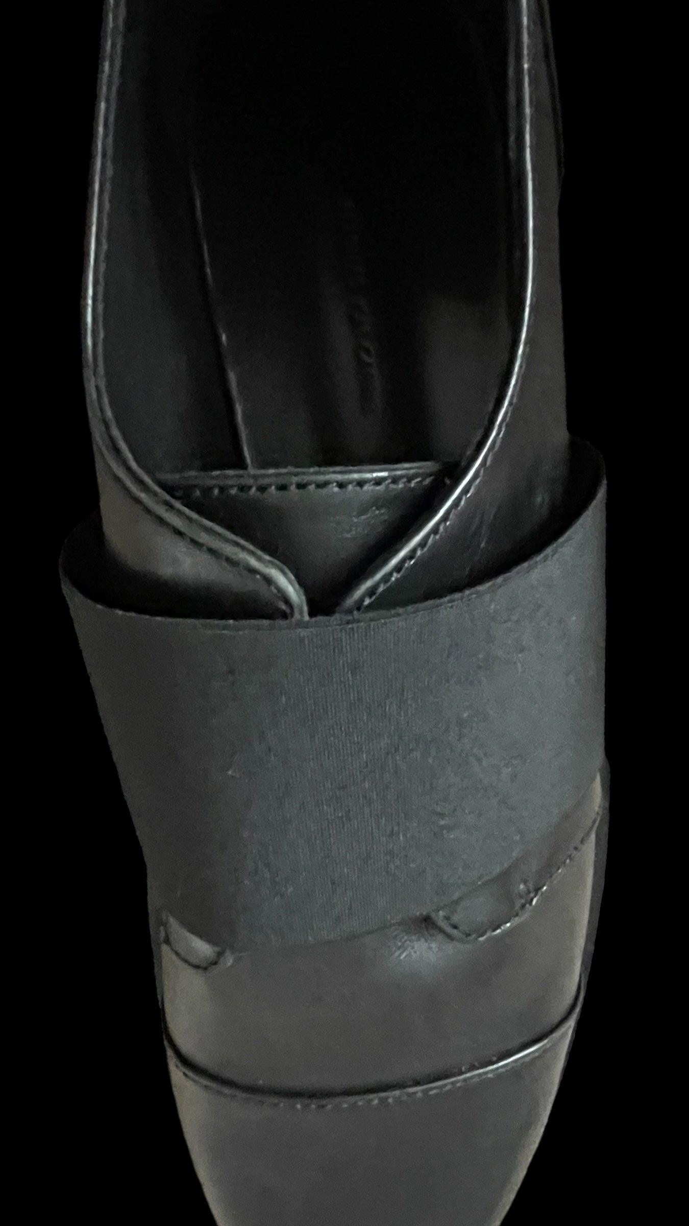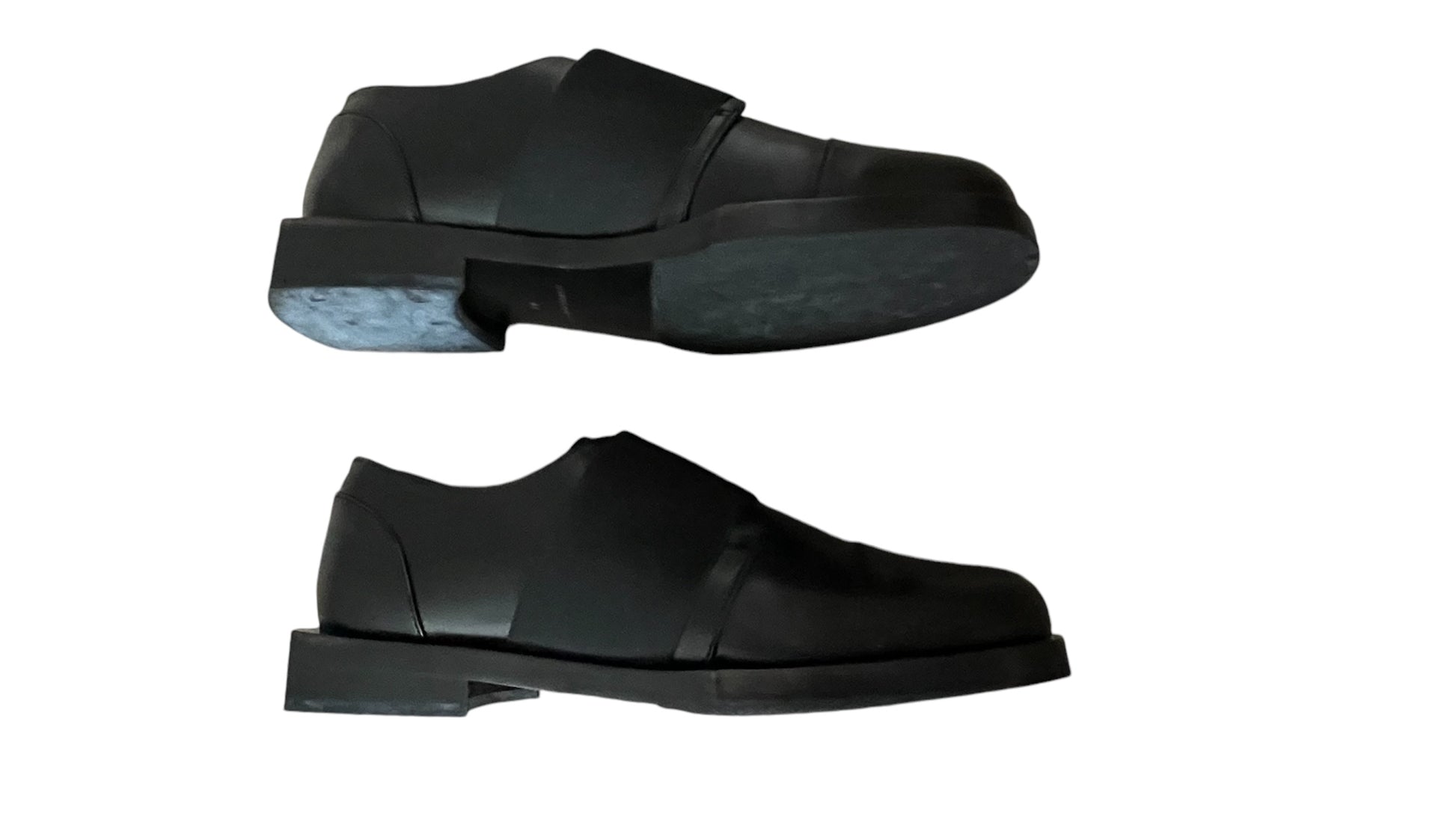 Men’s black cyclone leather slip on shoes by ACHILLES ION GABRIEL: wide thick elastic band top. Asymmetric sole. Leather and Rubber sole