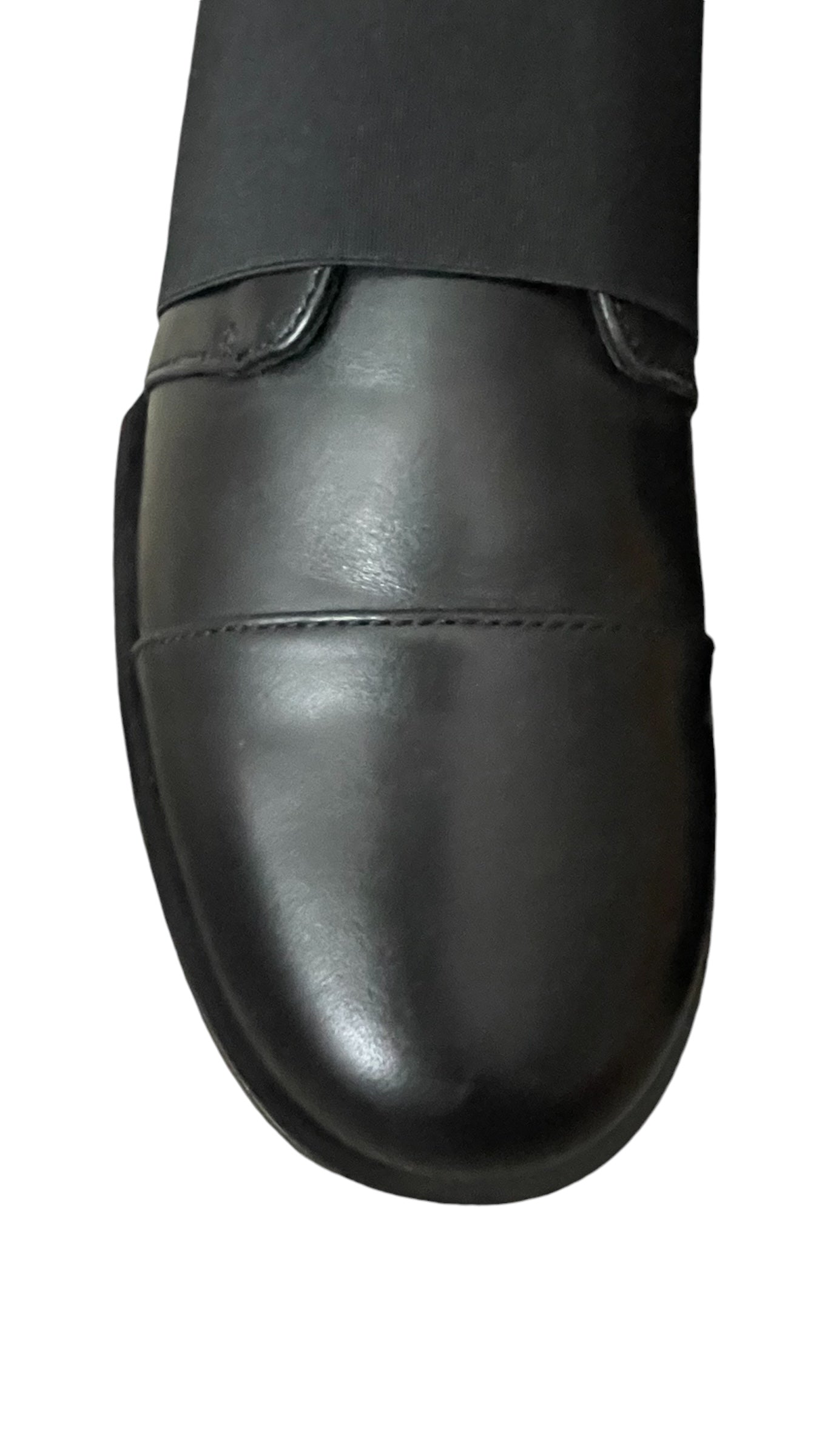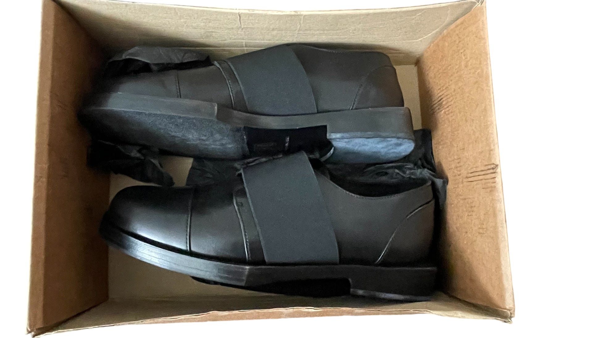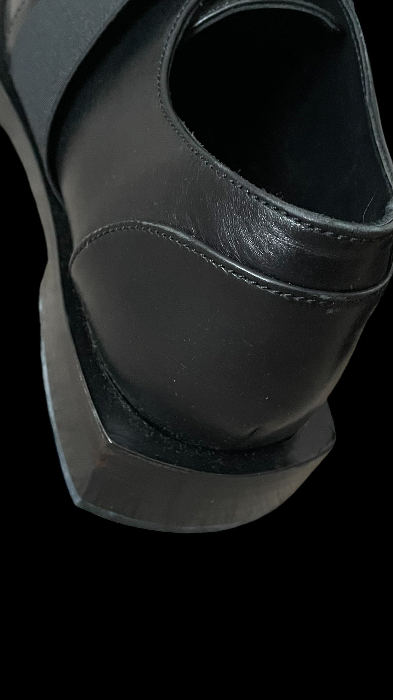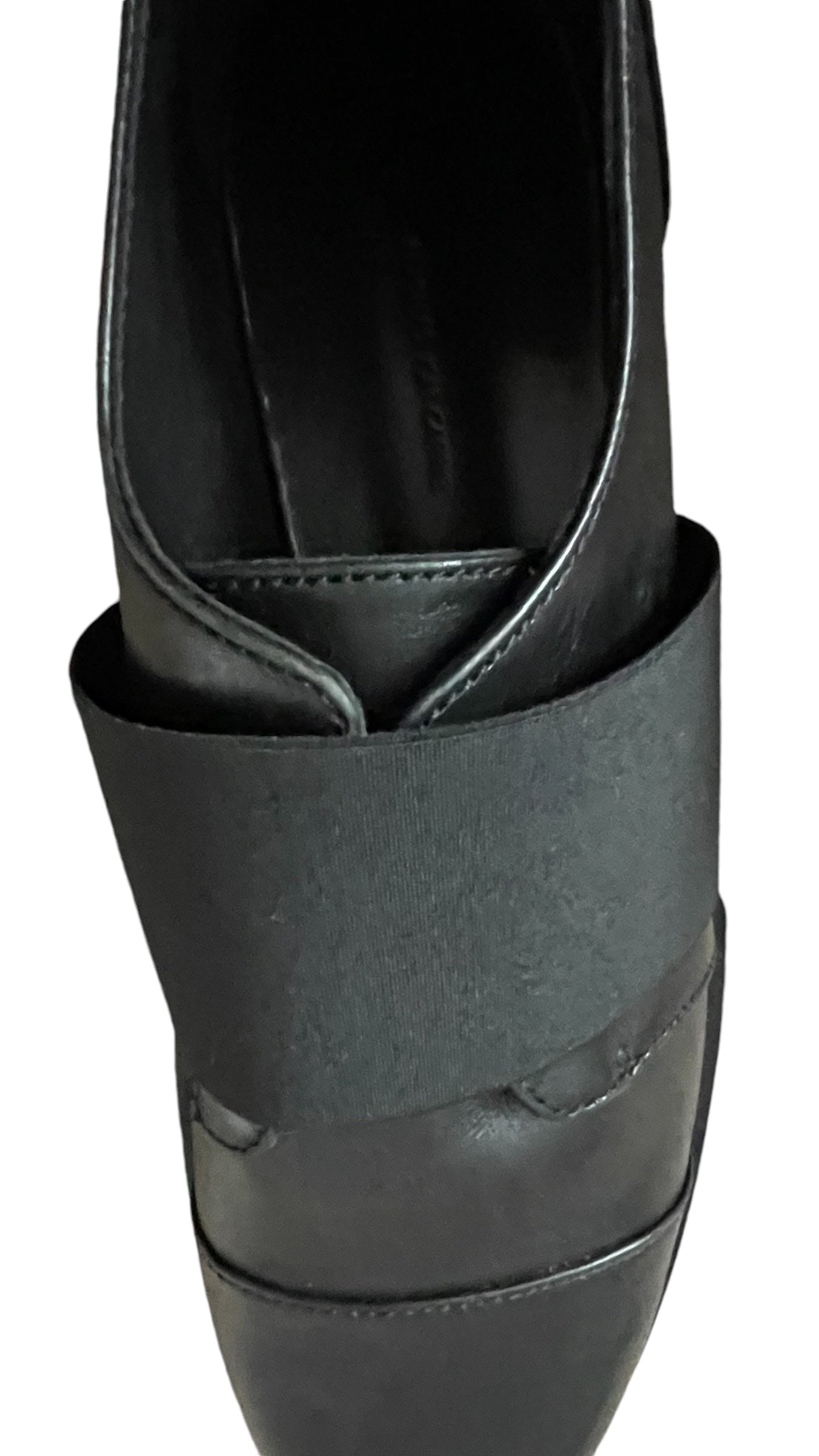 Men’s black cyclone leather slip on shoes by ACHILLES ION GABRIEL: wide thick elastic band top. Asymmetric sole. Leather and Rubber sole