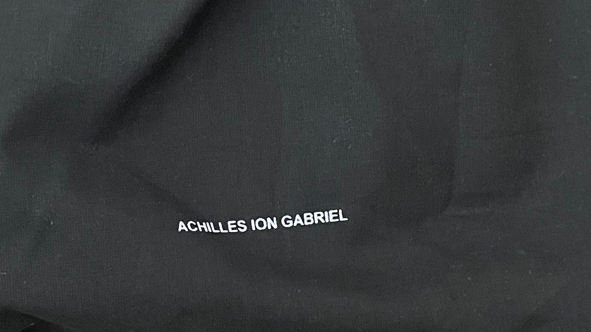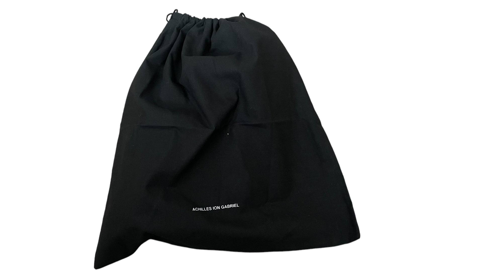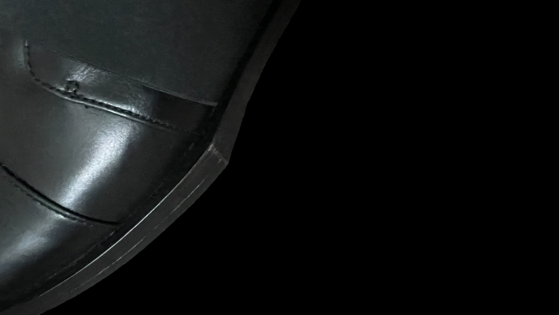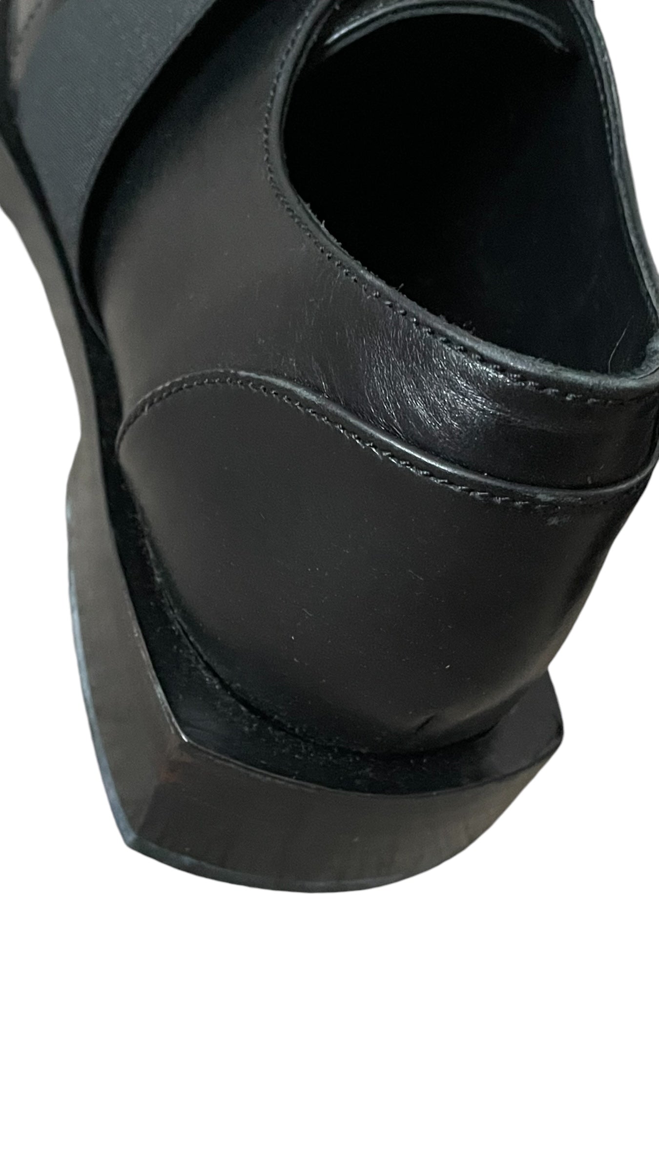 Men’s black cyclone leather slip on shoes by ACHILLES ION GABRIEL: wide thick elastic band top. Asymmetric sole. Leather and Rubber sole