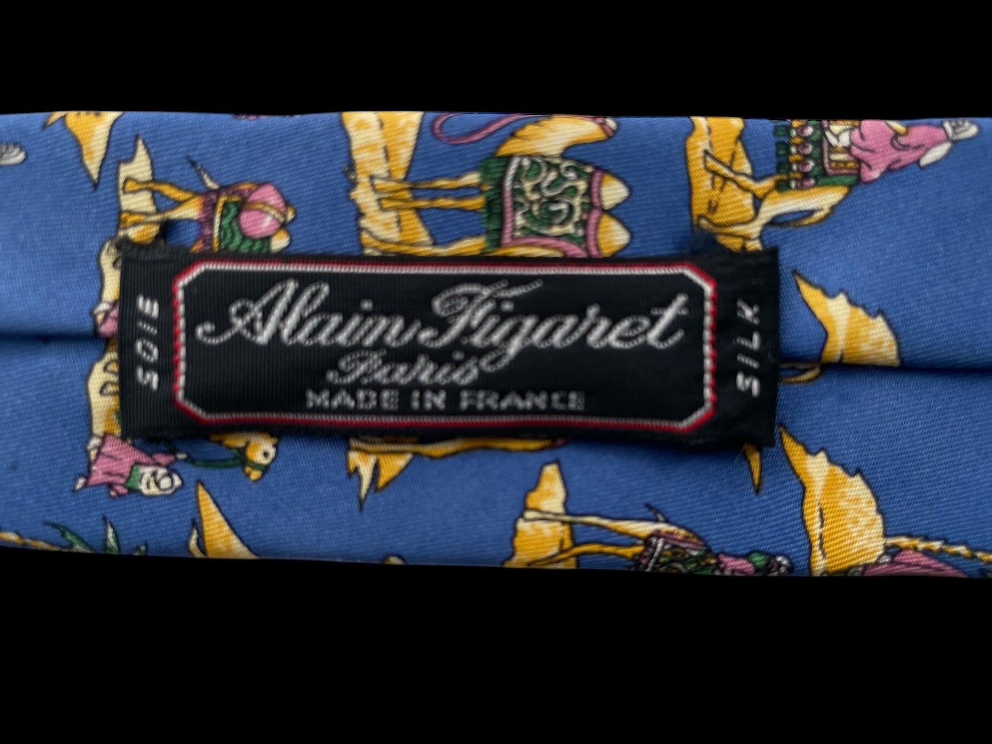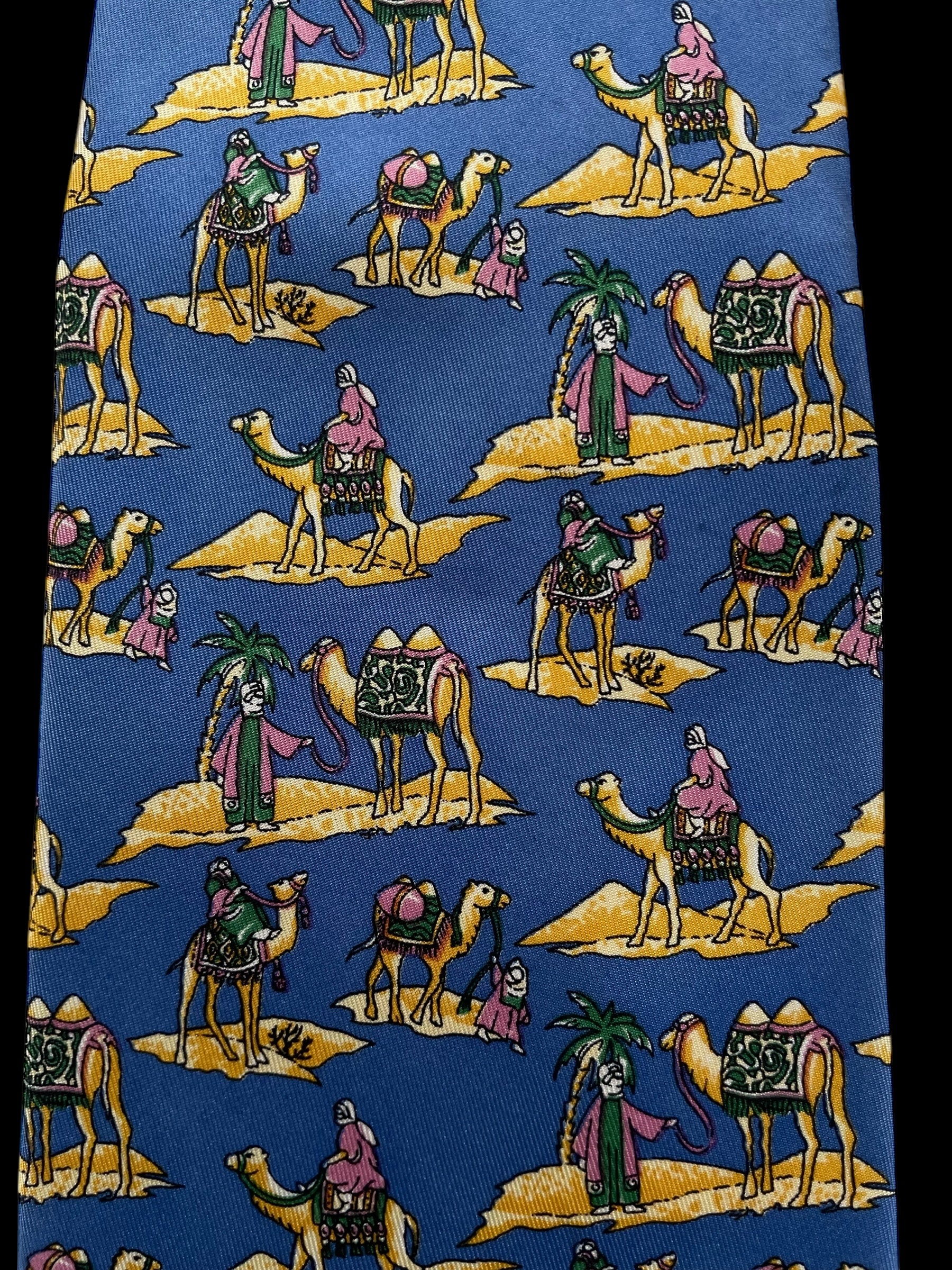 Vintage silk tie by ALAIN FIGARET: blue with pink, green, golden, light yellow, black and white camels printed.