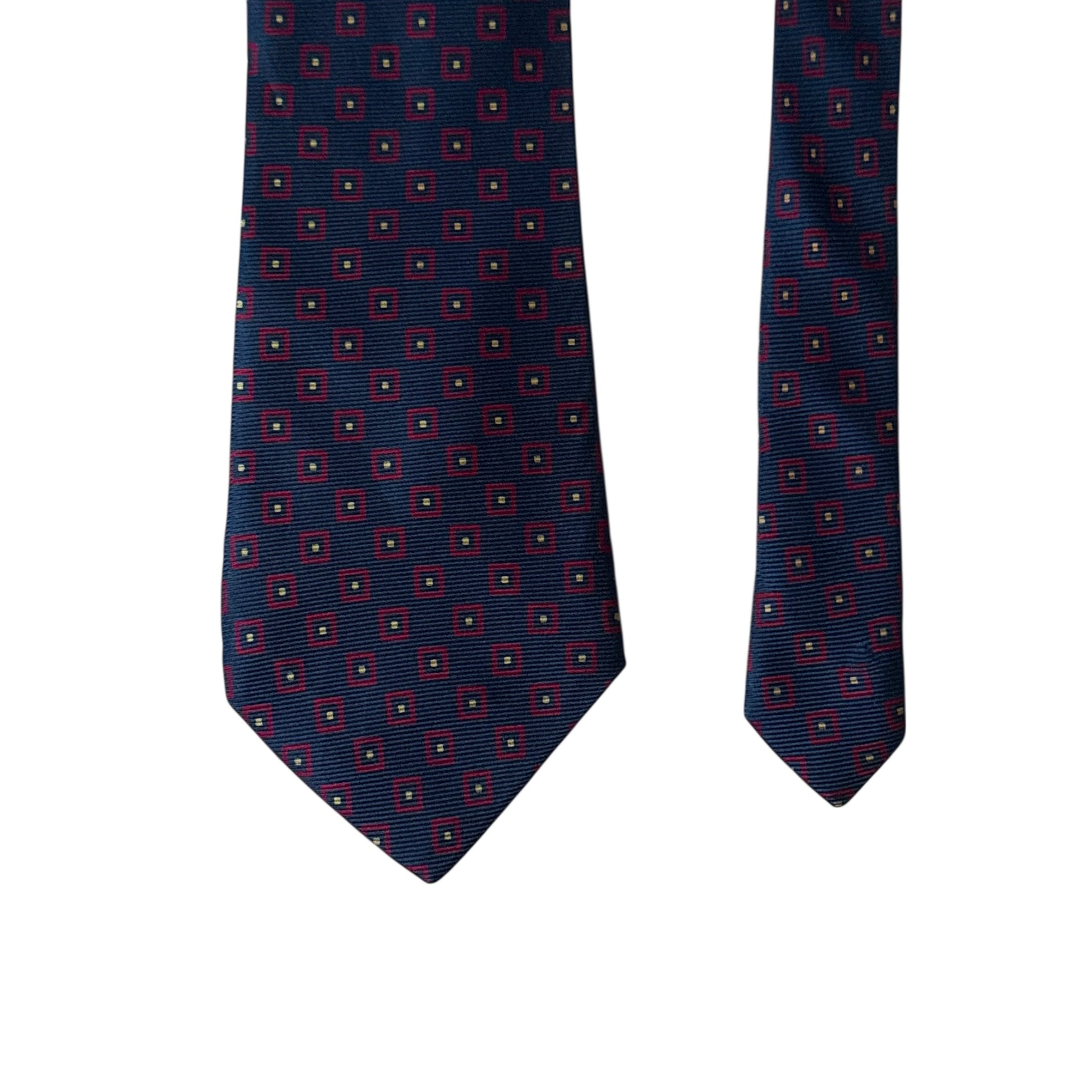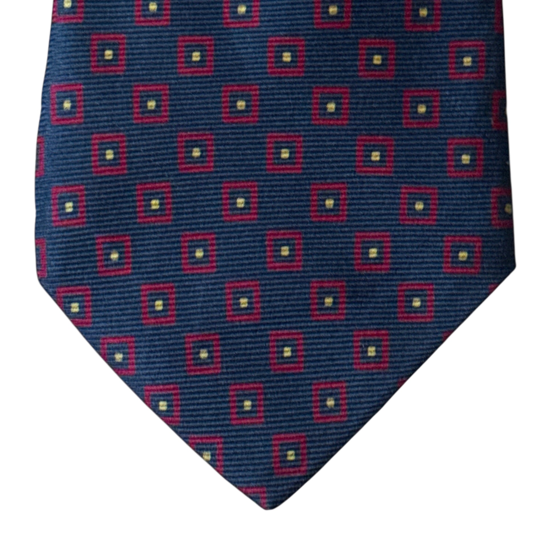 Vintage silk tie by BERTEIL: navy blue with red, and yellow geometric dots design.