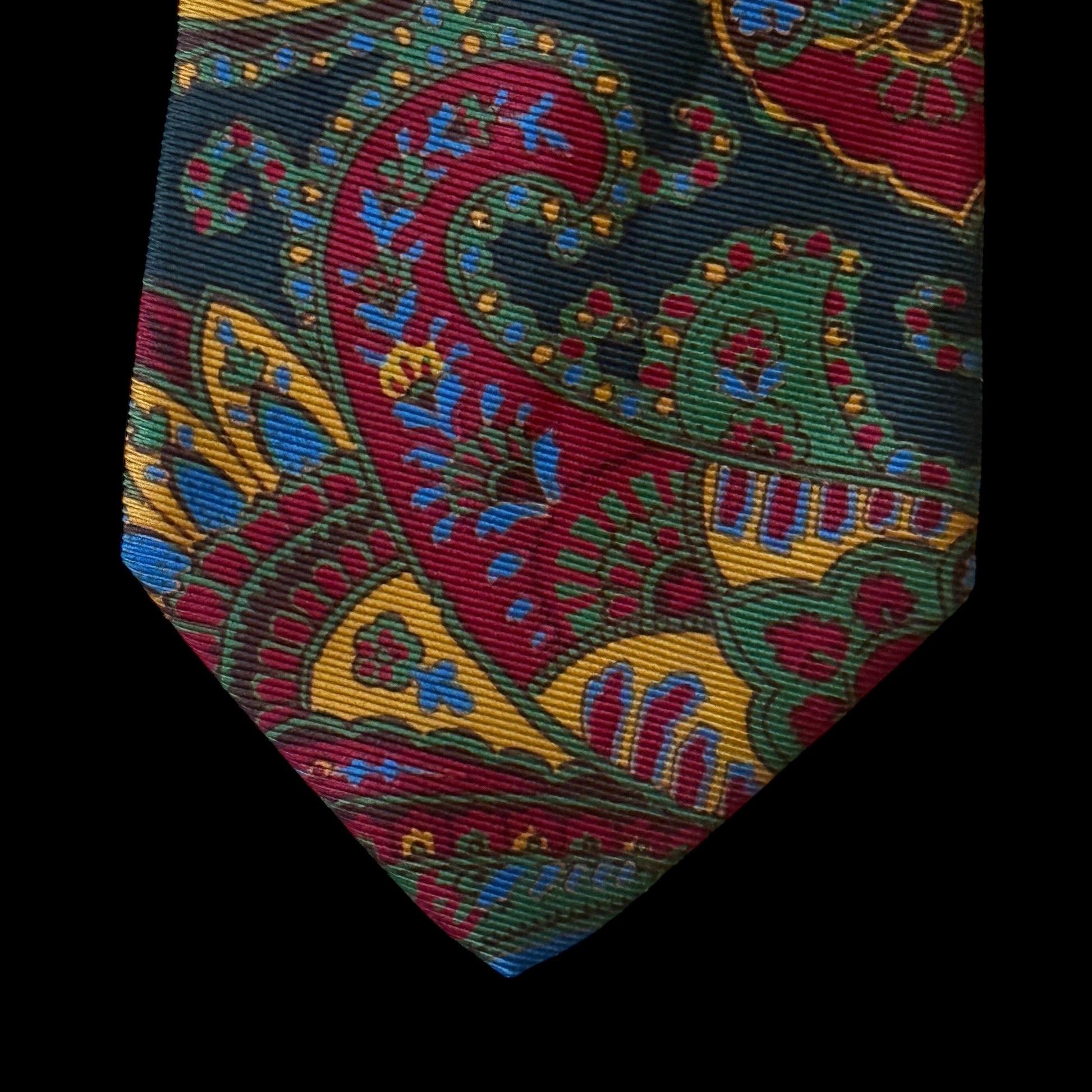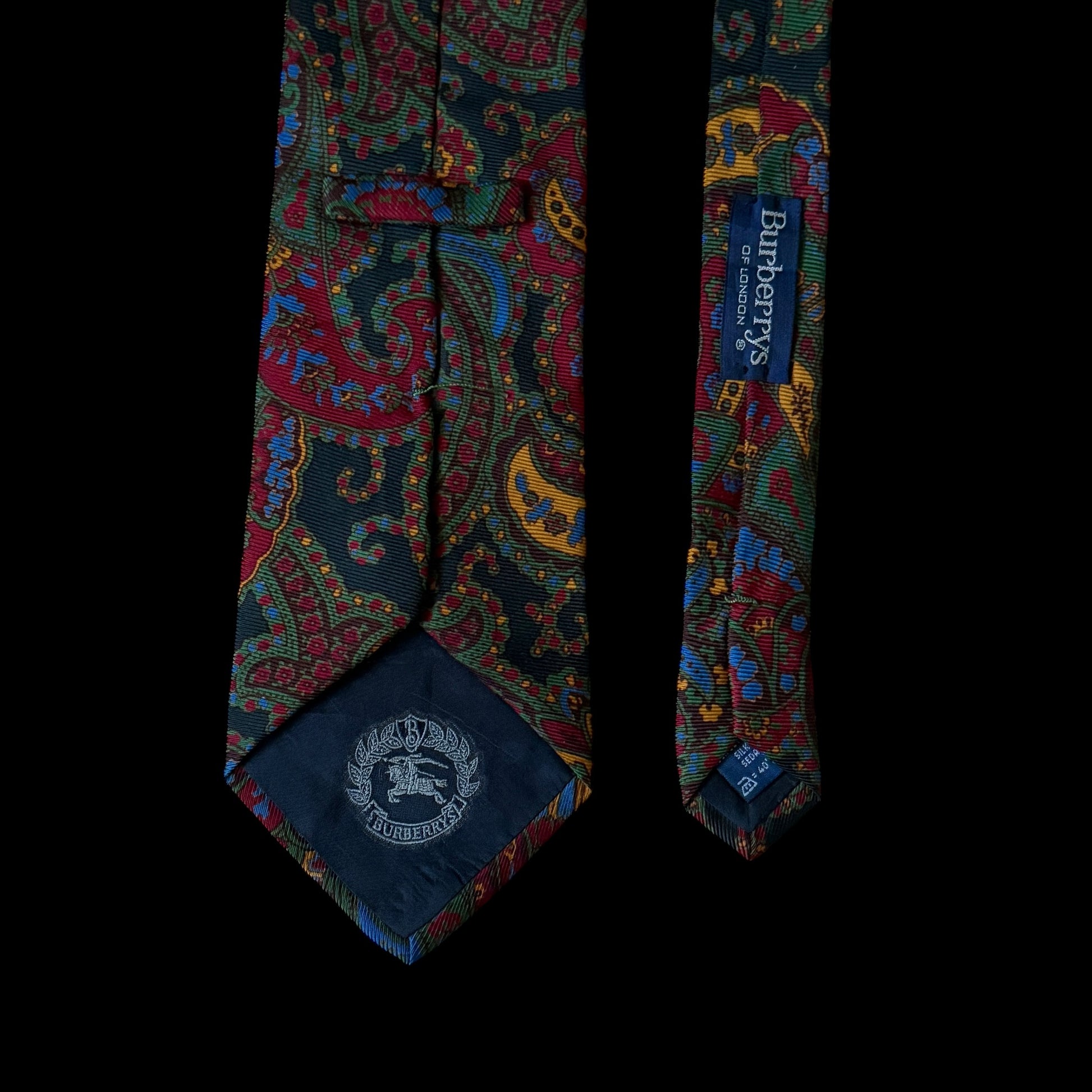 Vintage silk tie by BURBERRYS: black with green, burgundy, golden, red, and electric blue bold paisley design.