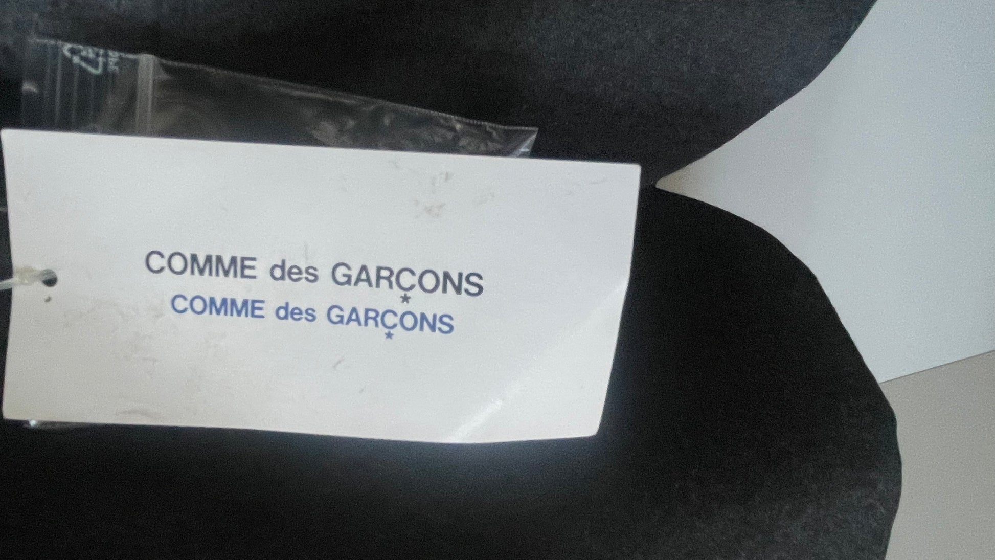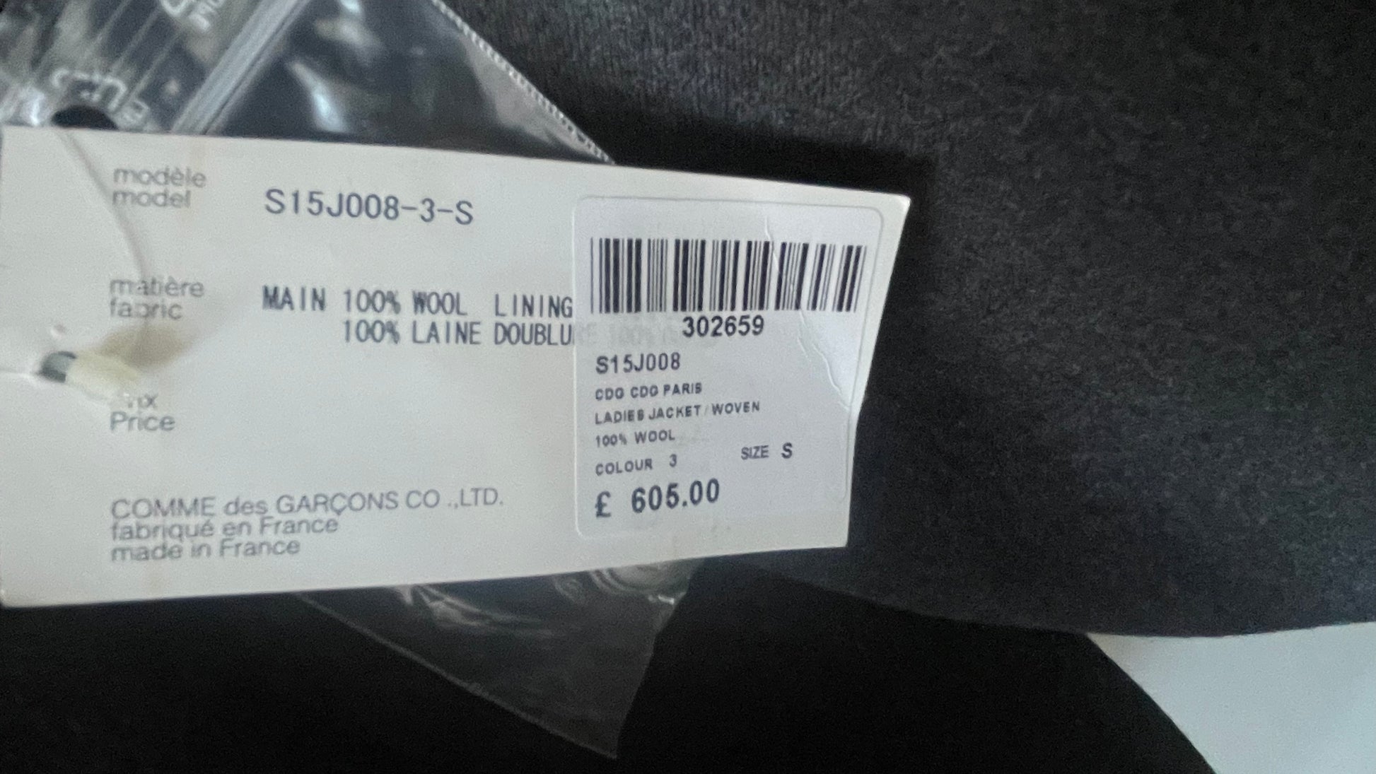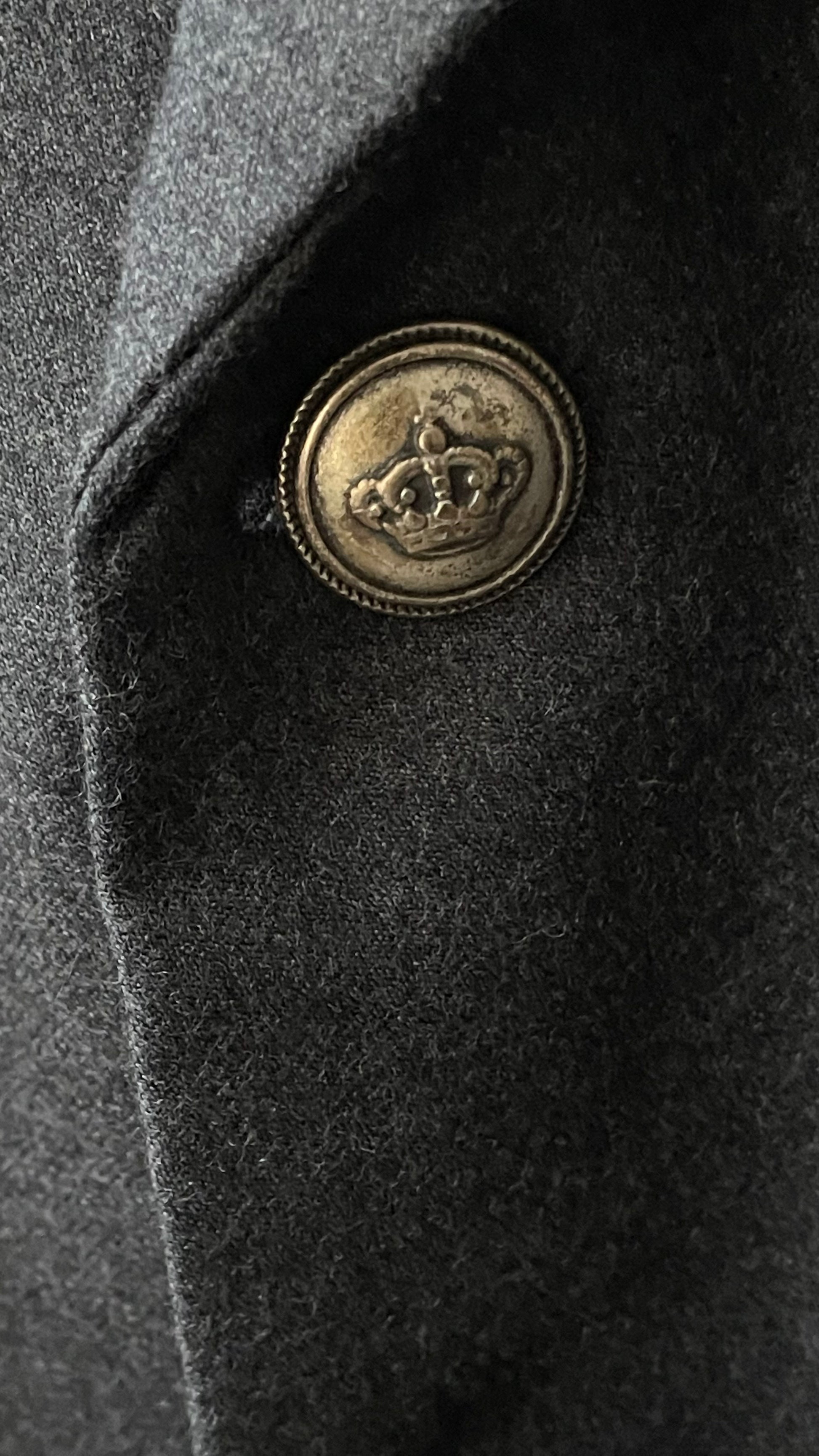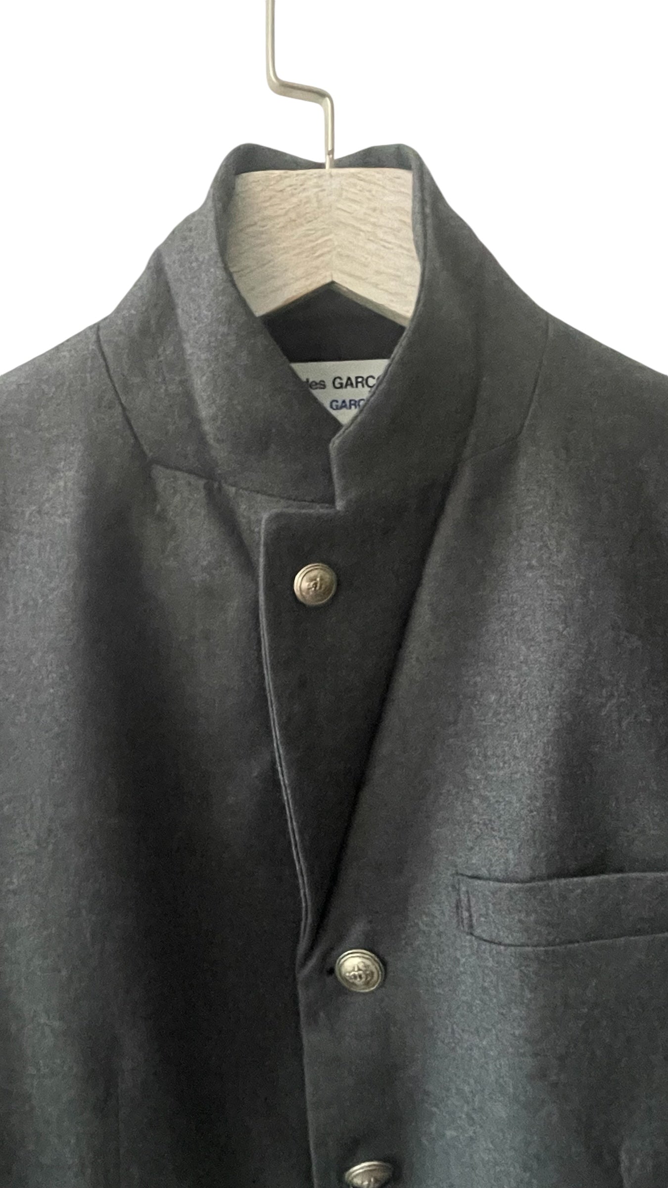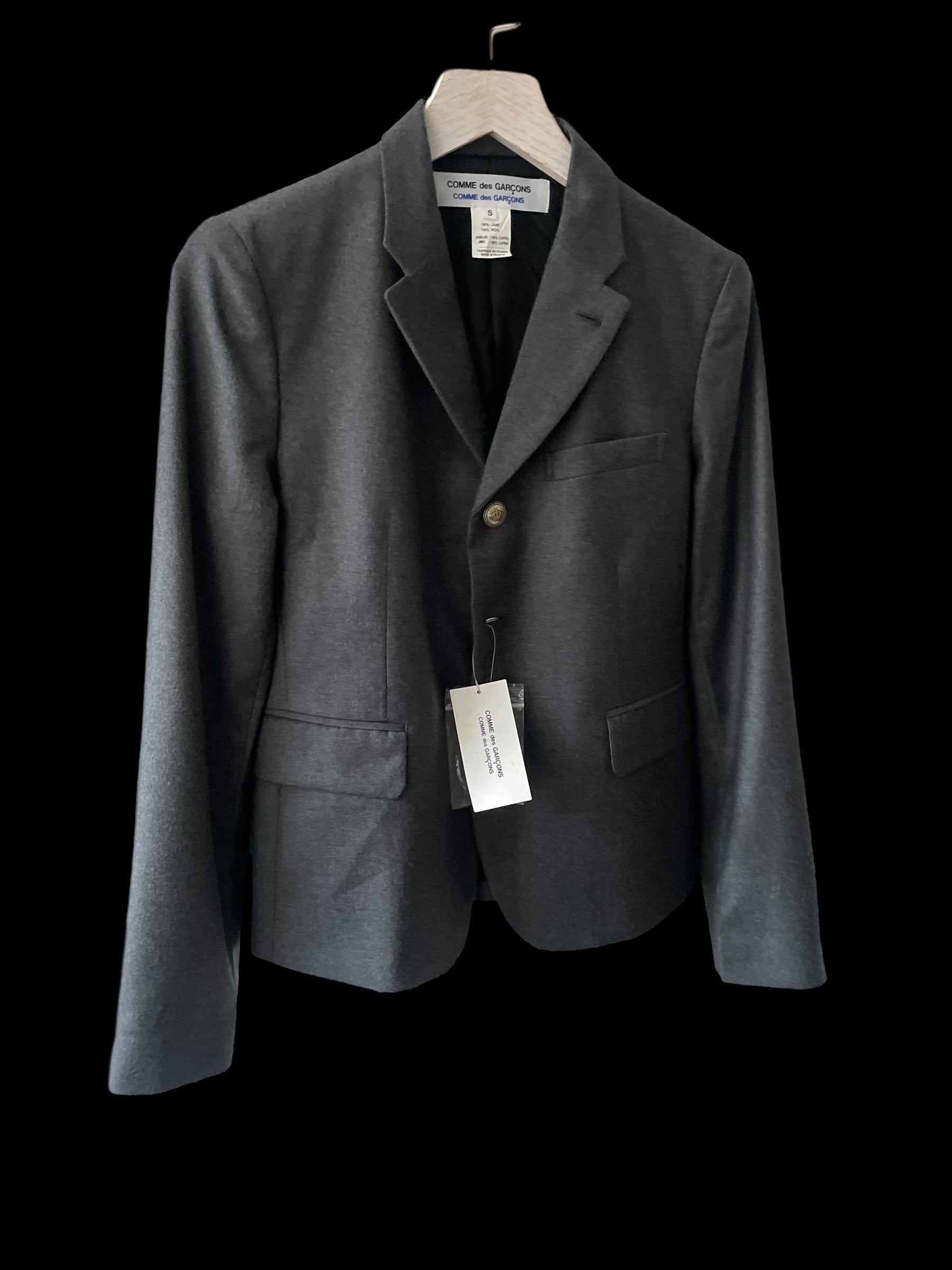 Comme des Garçons soft lightweight wool jacket. It has a peaked lapel, 2 flap pockets, 3 silver crown buttons, no shoulder pads, 3 silver crown cuff buttons at each sleeve and back middle vent
