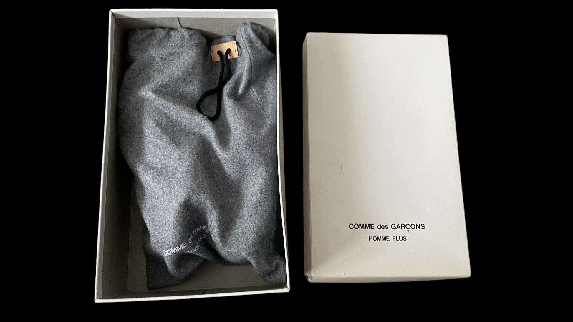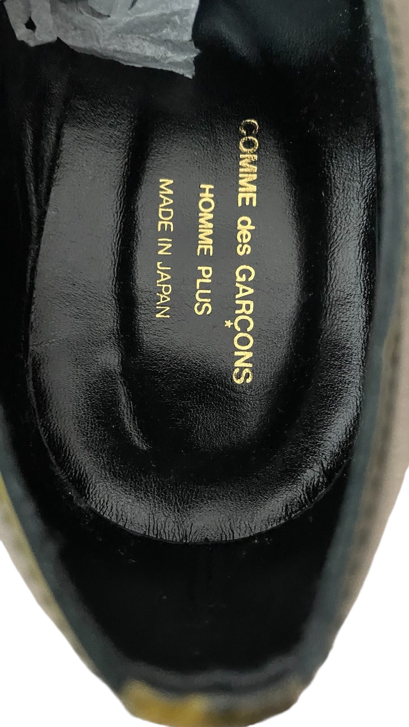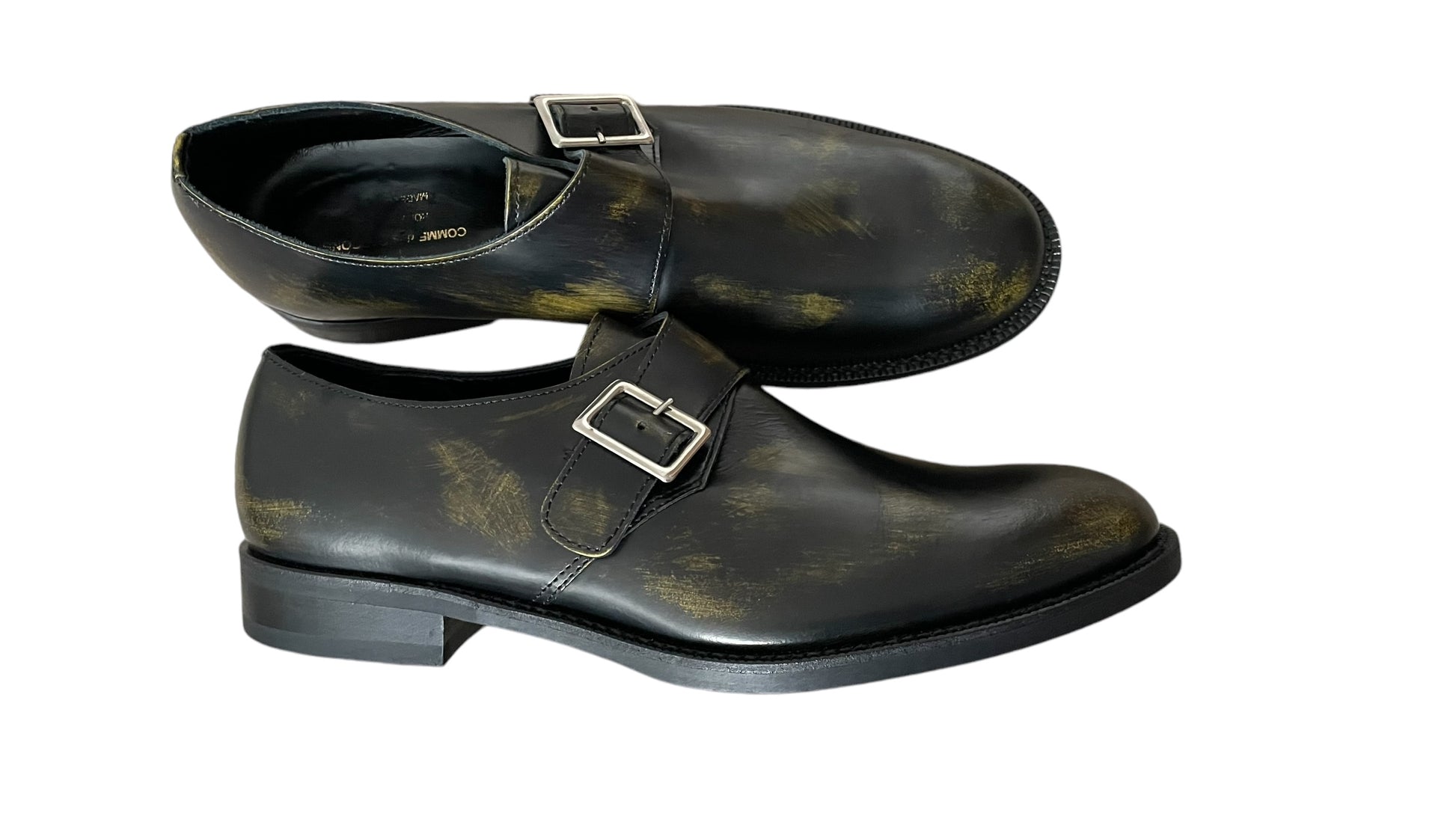 Men’s leather shoes by CdG Homme Plus: black olive green with silver side buckle. Rubber sole