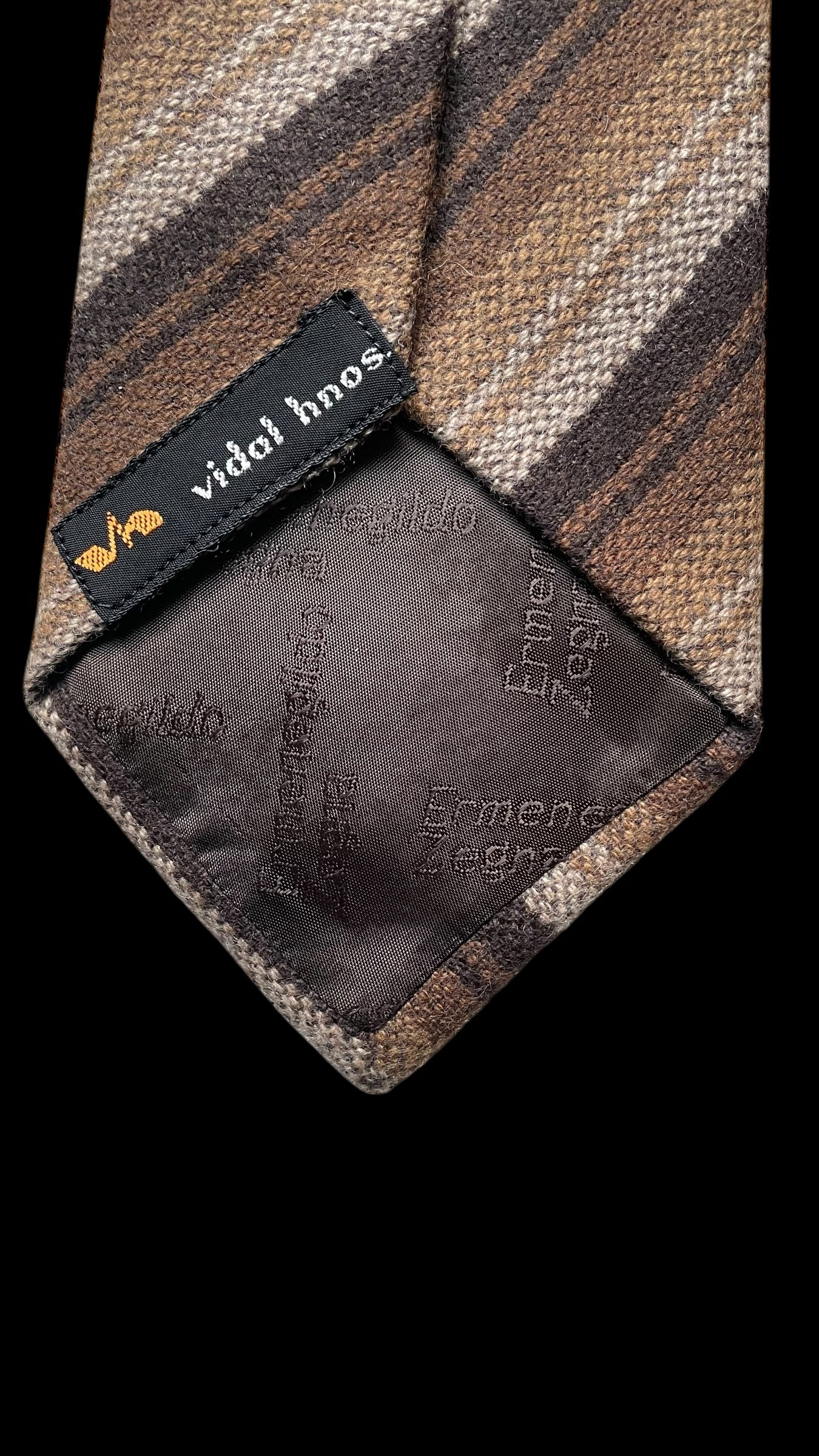 Vintage 100% cashmere tie by ERMENEGILDO ZEGNA: dark brown with brown light brown, and beige stripes printed.