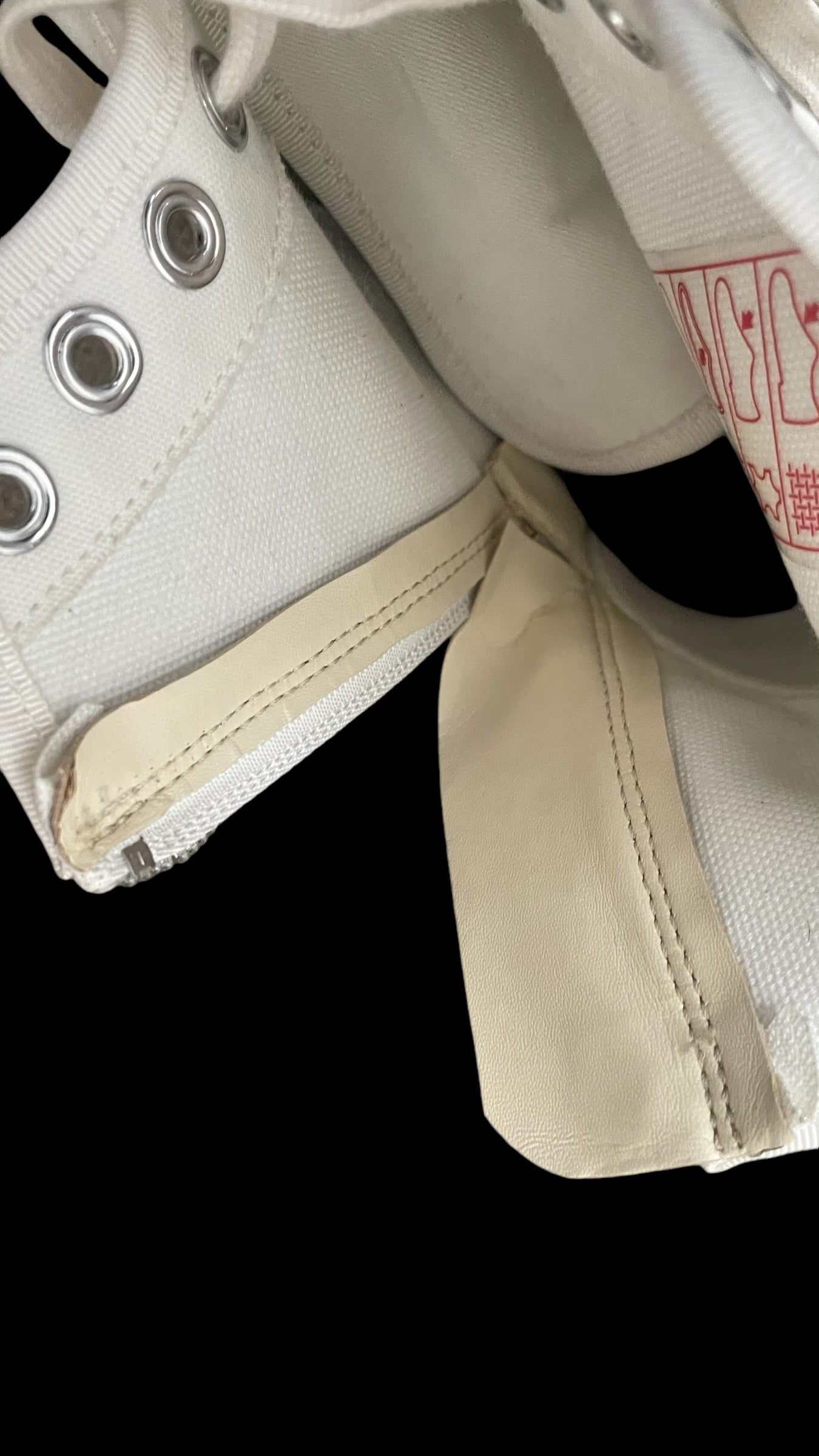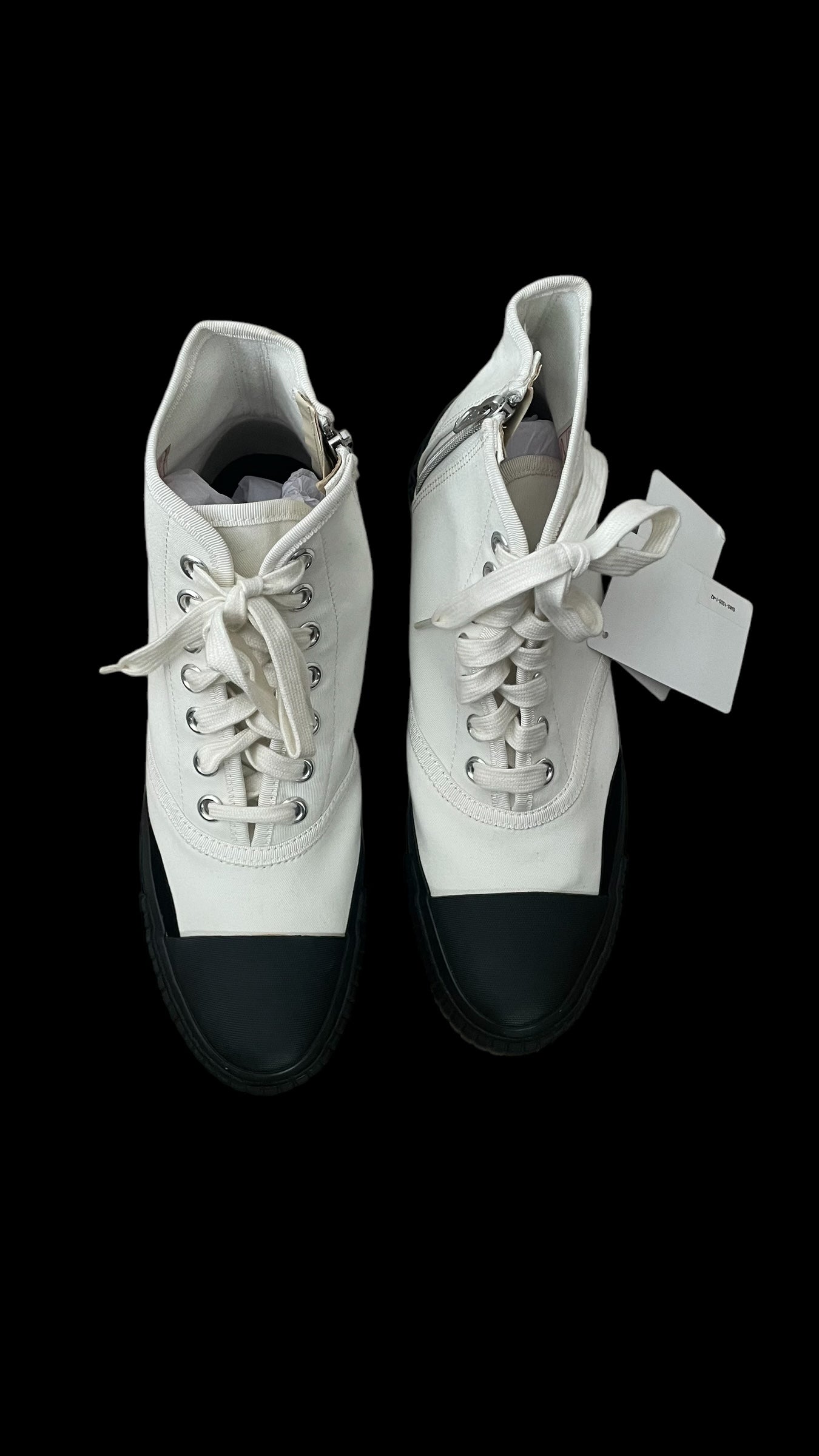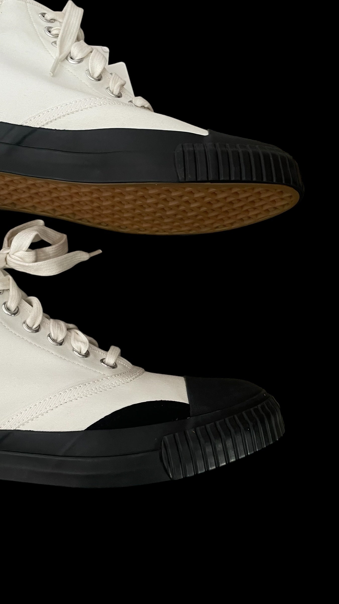 Men’s off-white high-top sneakers:black rubber trimmed.YKK zip closure with beige leather trim inside.Rubber sole