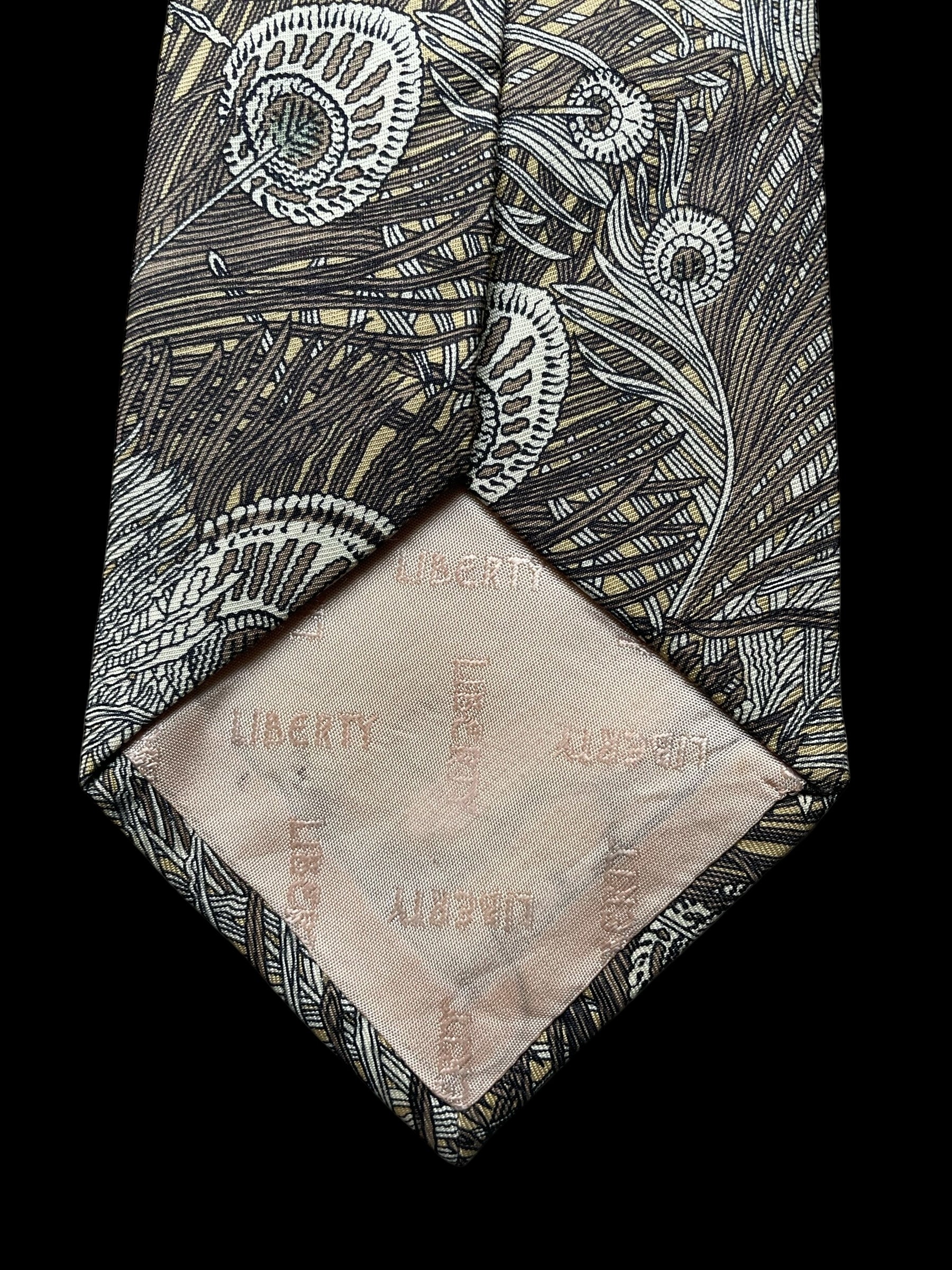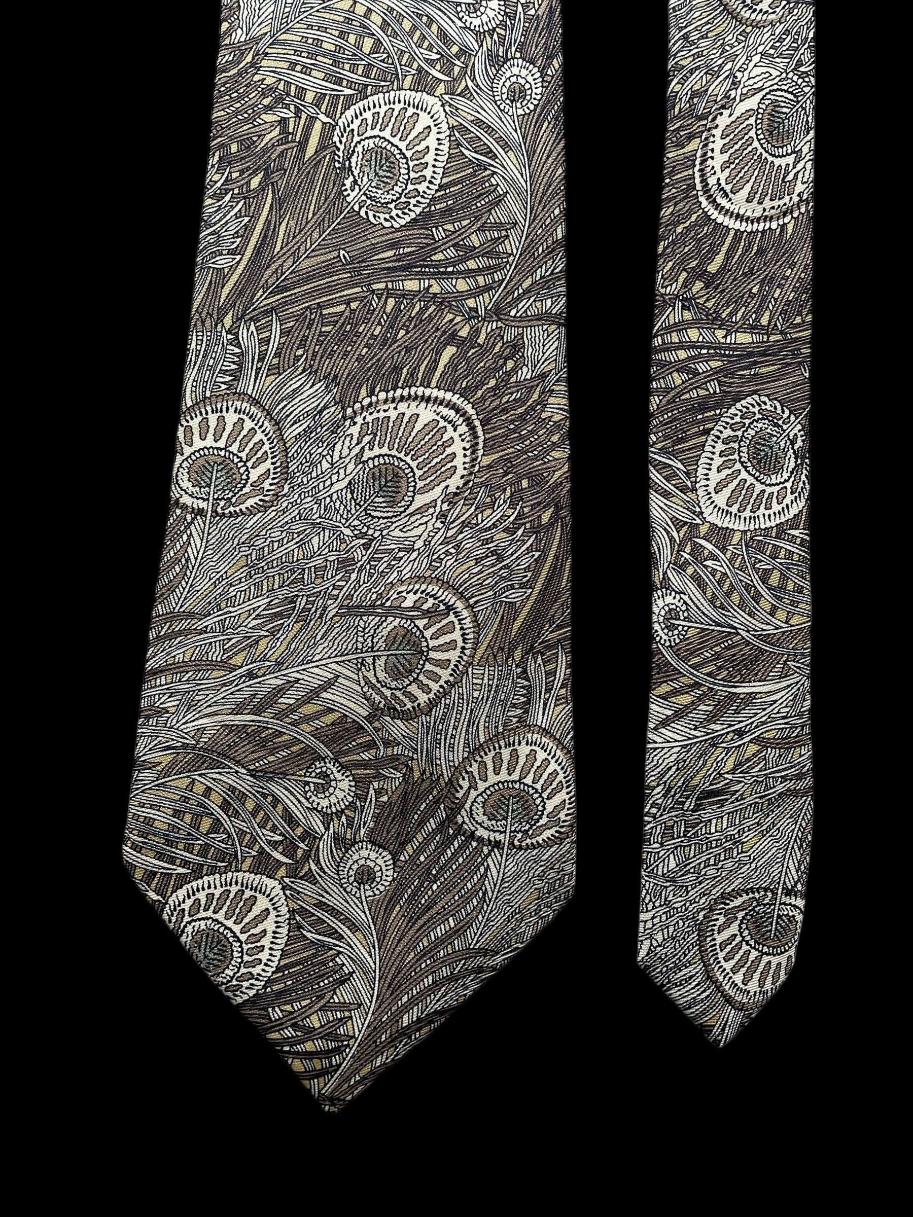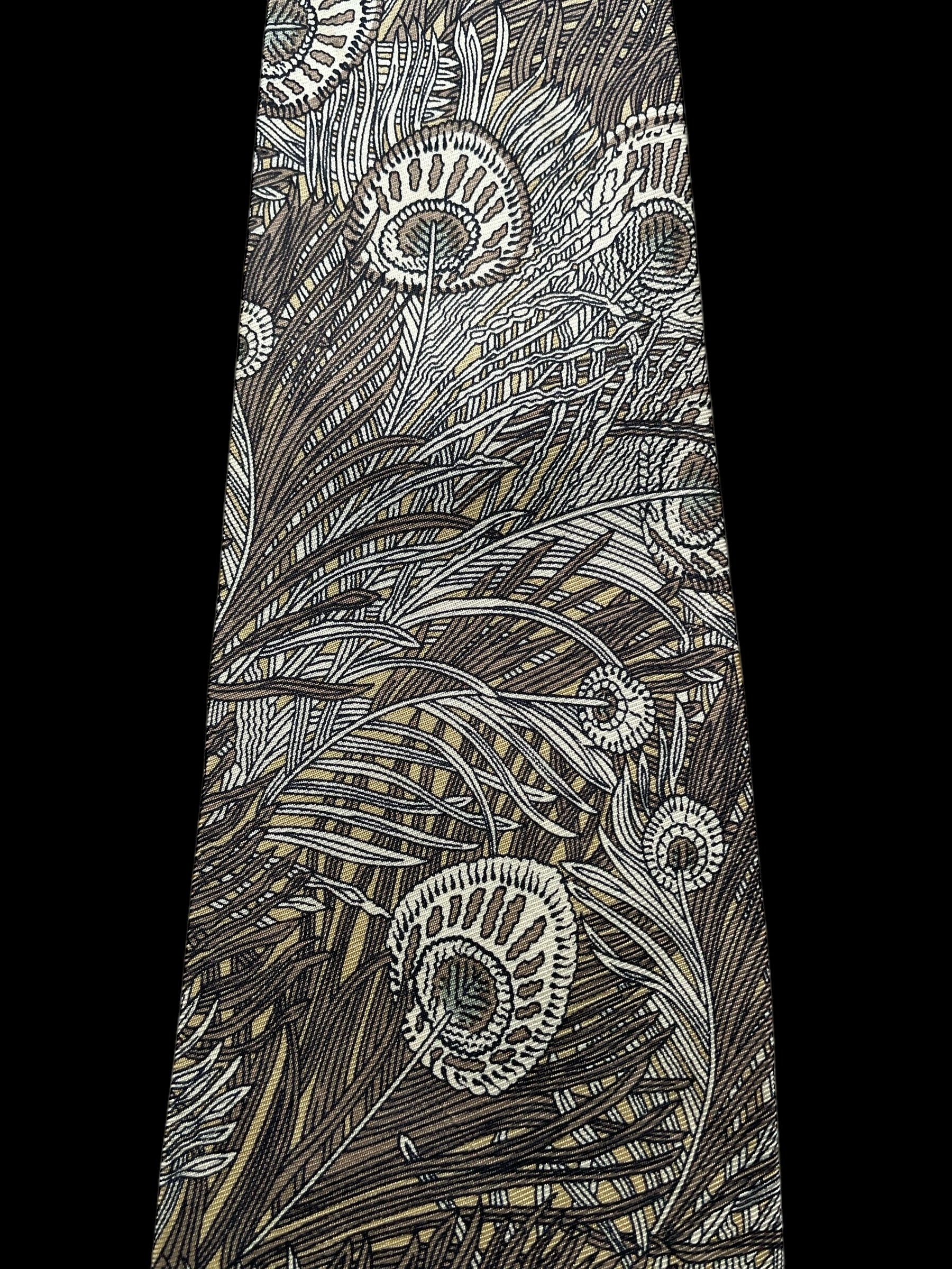 Vintage silk tie by LIBERTY: brown with beige, dark brown, black, and butter colour peacock feathers printed.