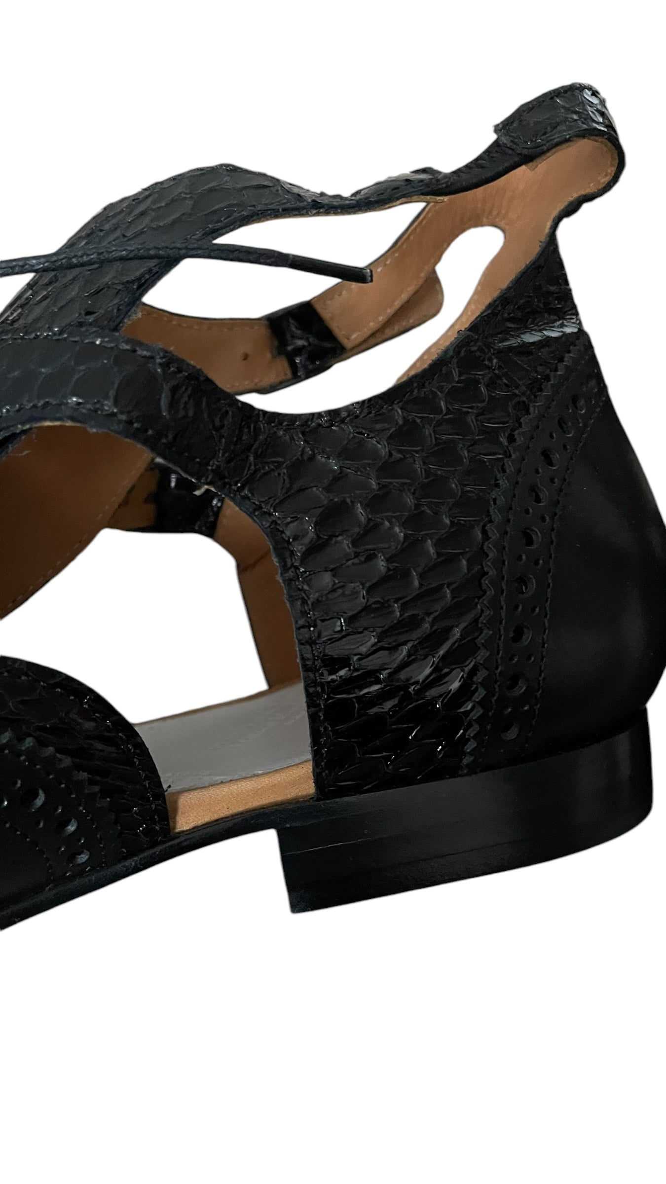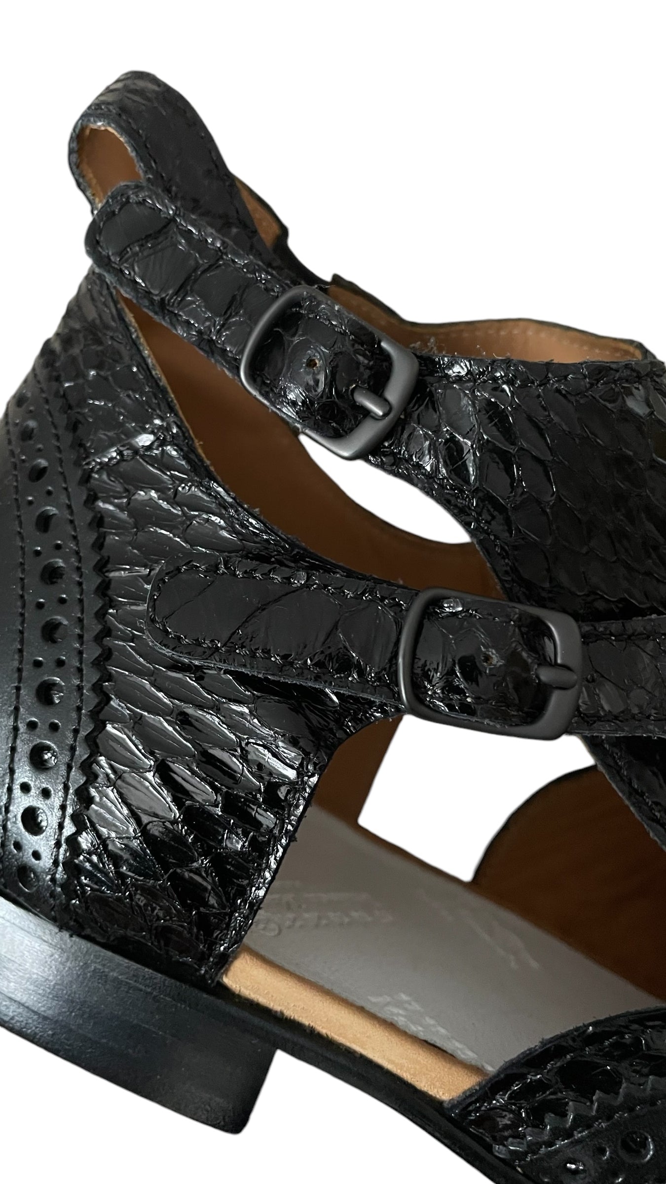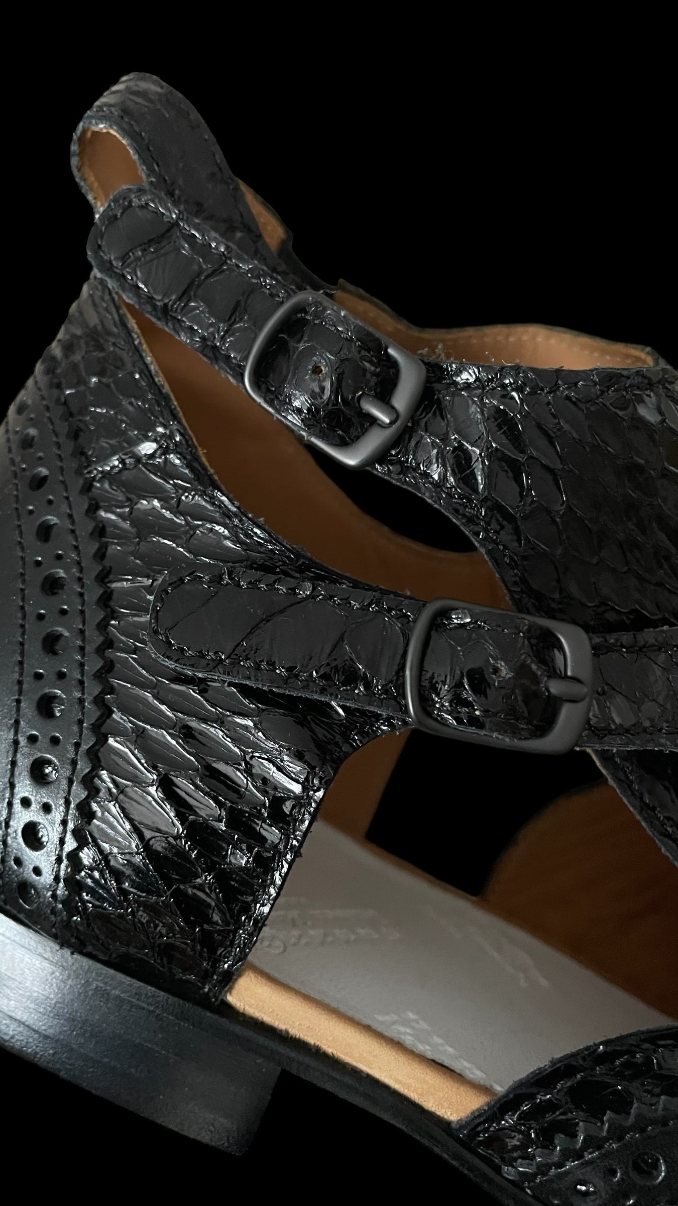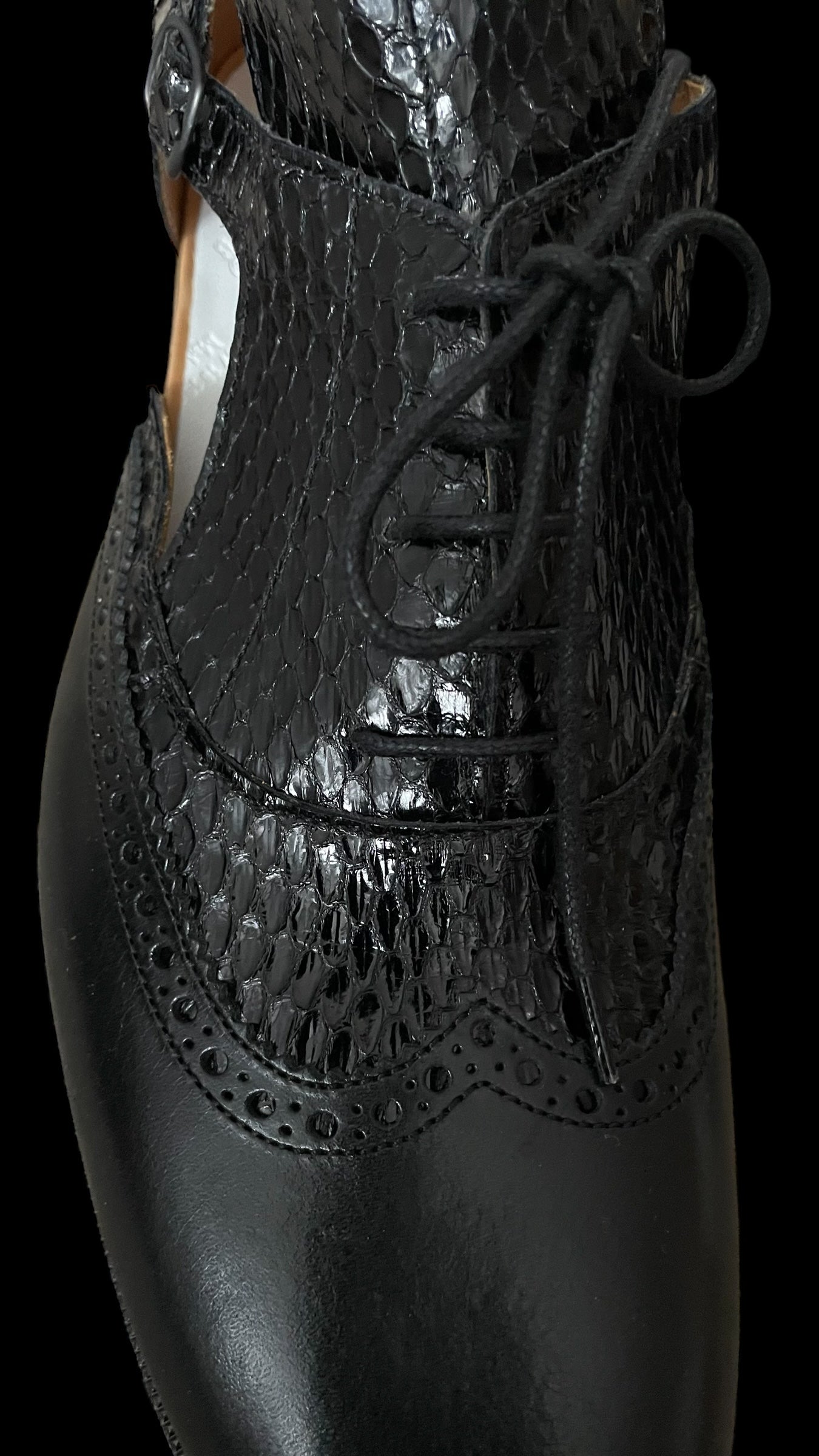 Women’s open buckle leather lace-up shoes by MAISON MARGIELA: black leather with black snake skin leather top. 2 buckles and elasticated closure. Leather sole