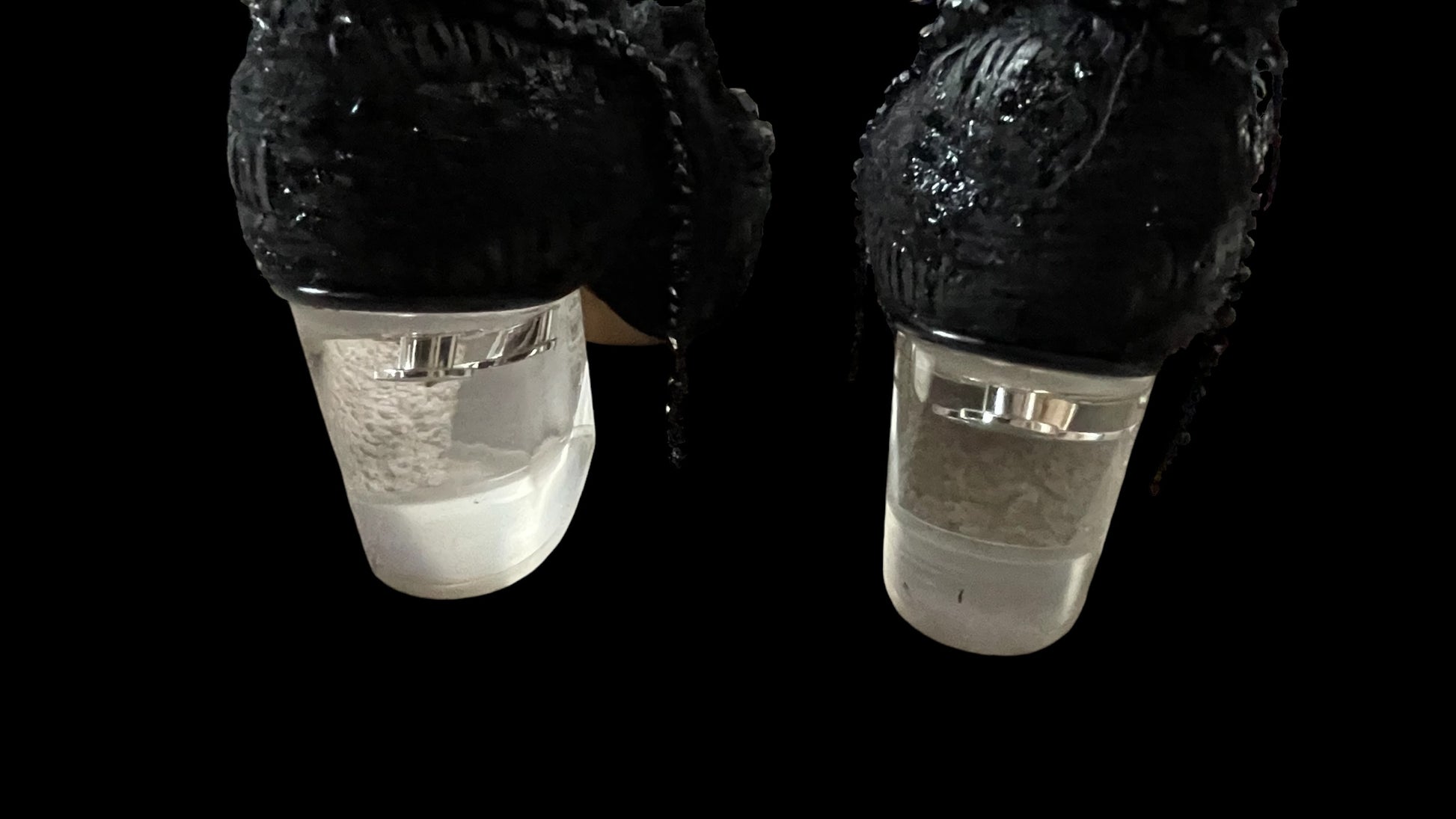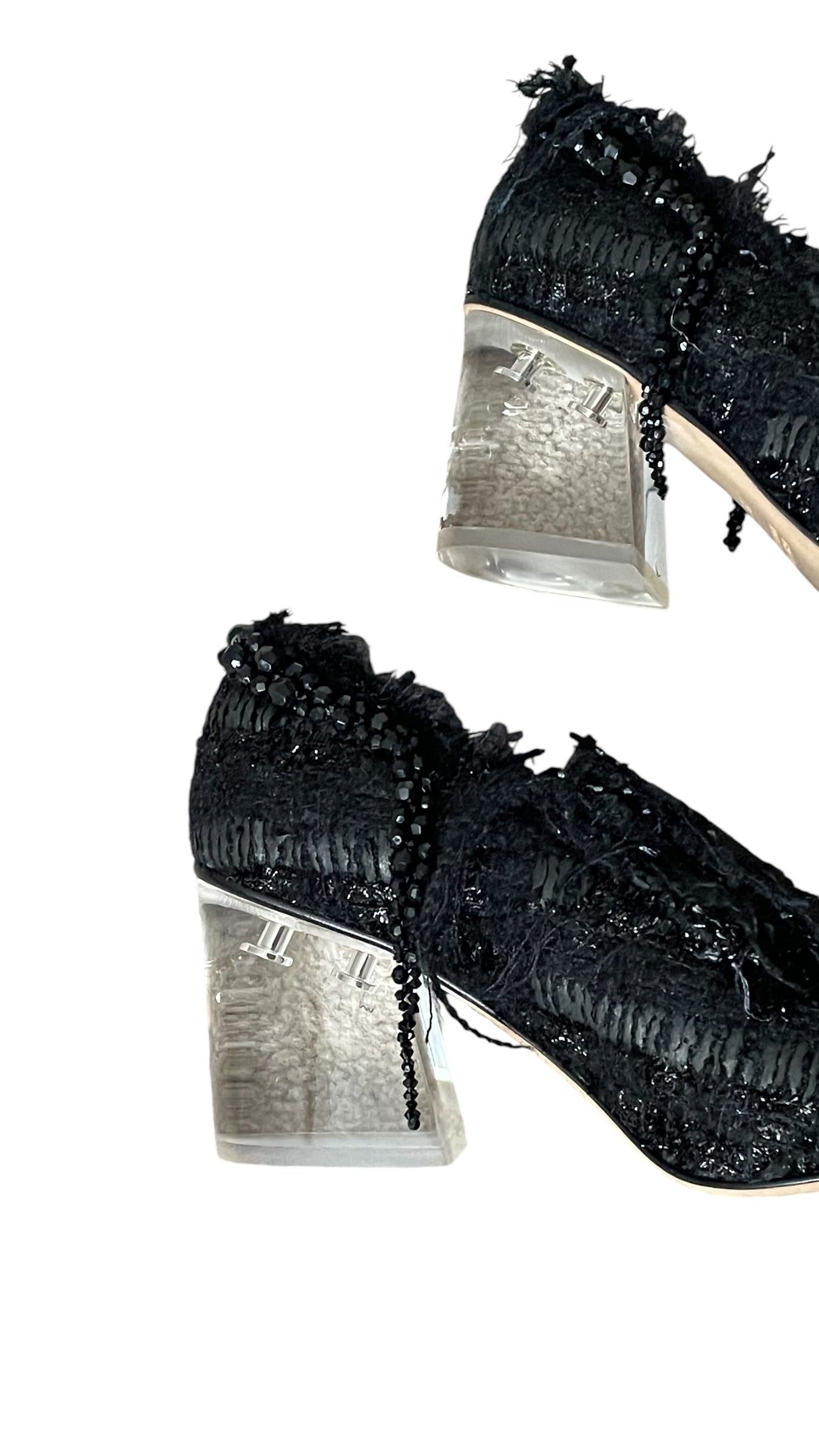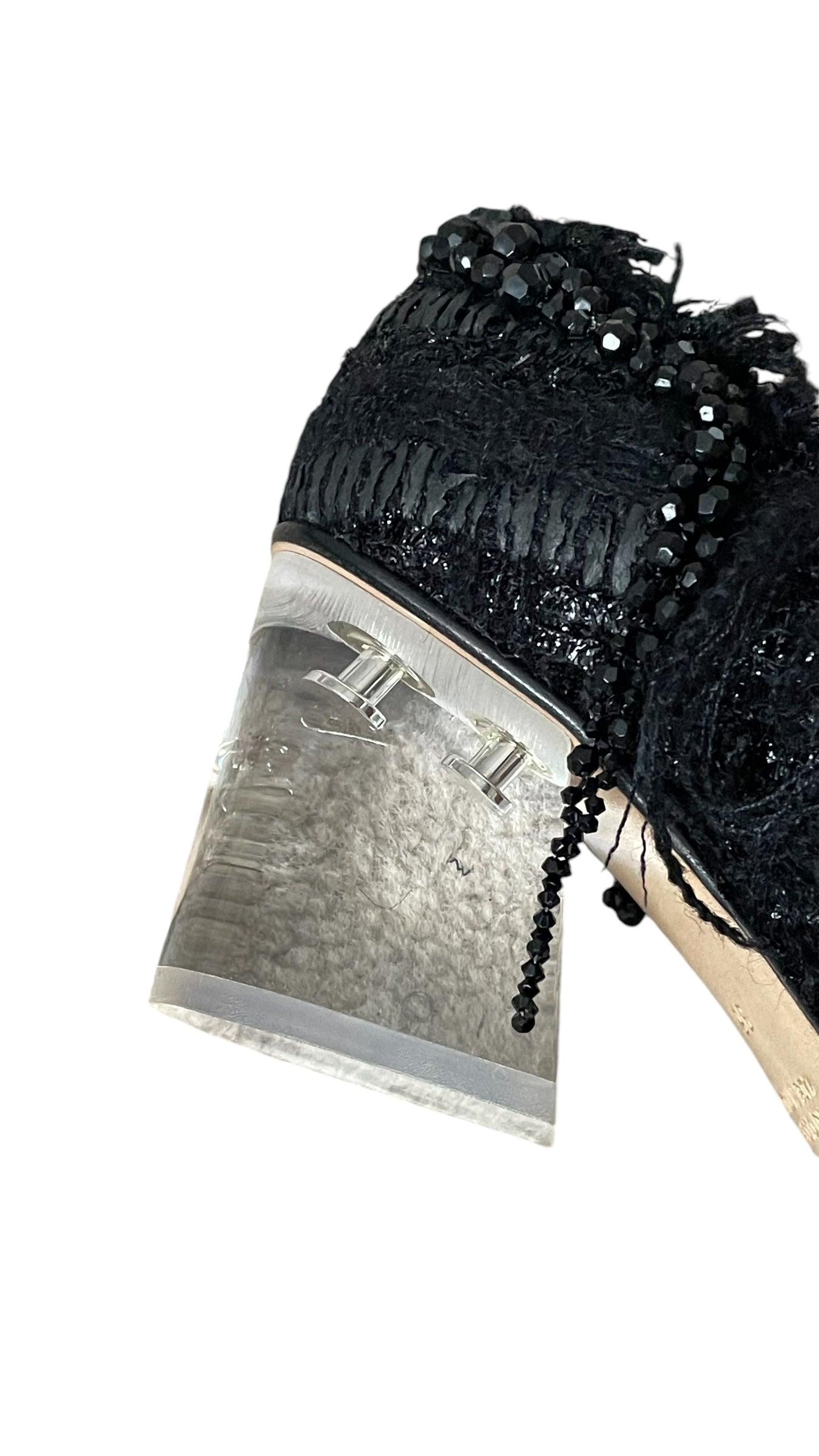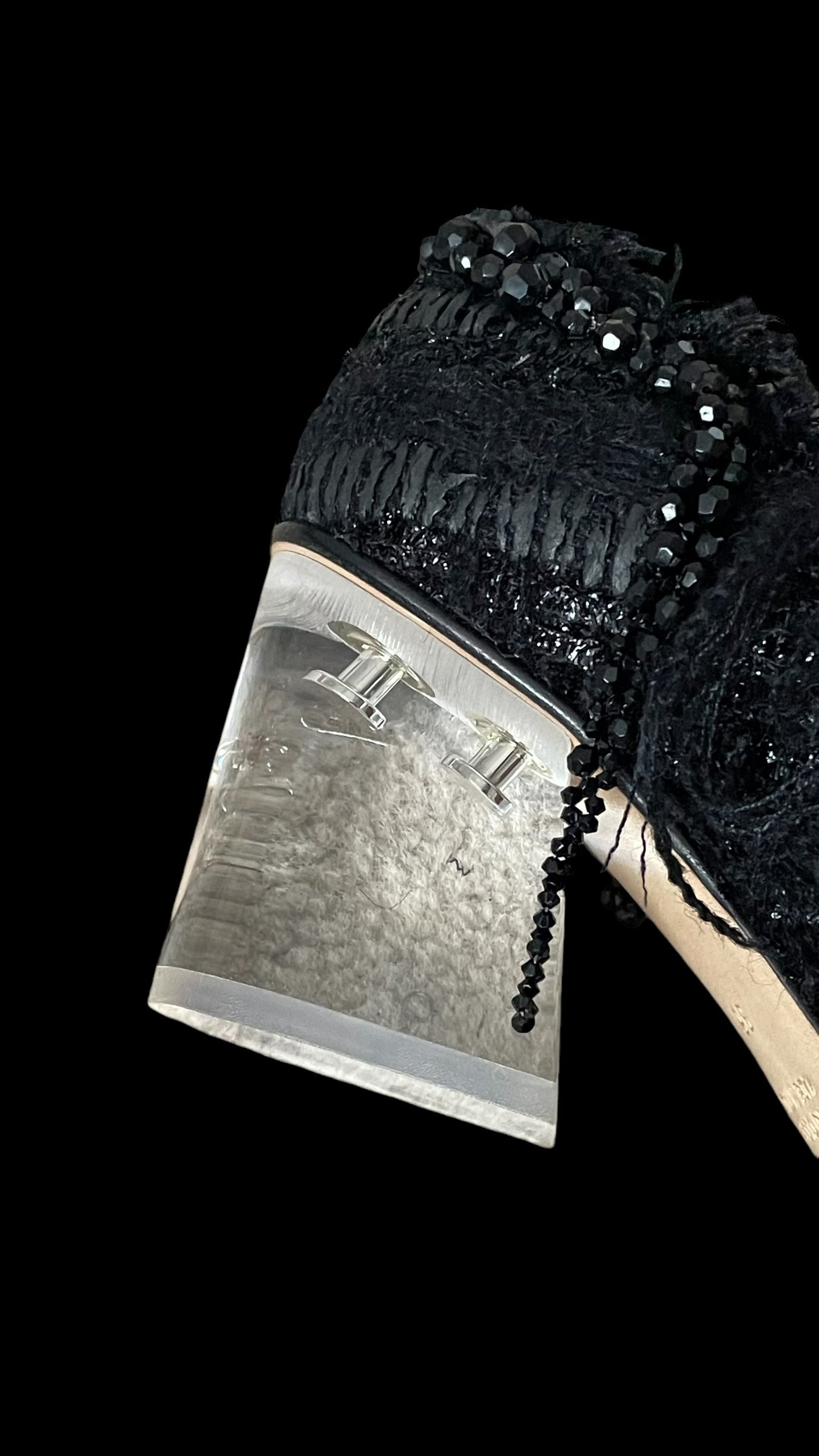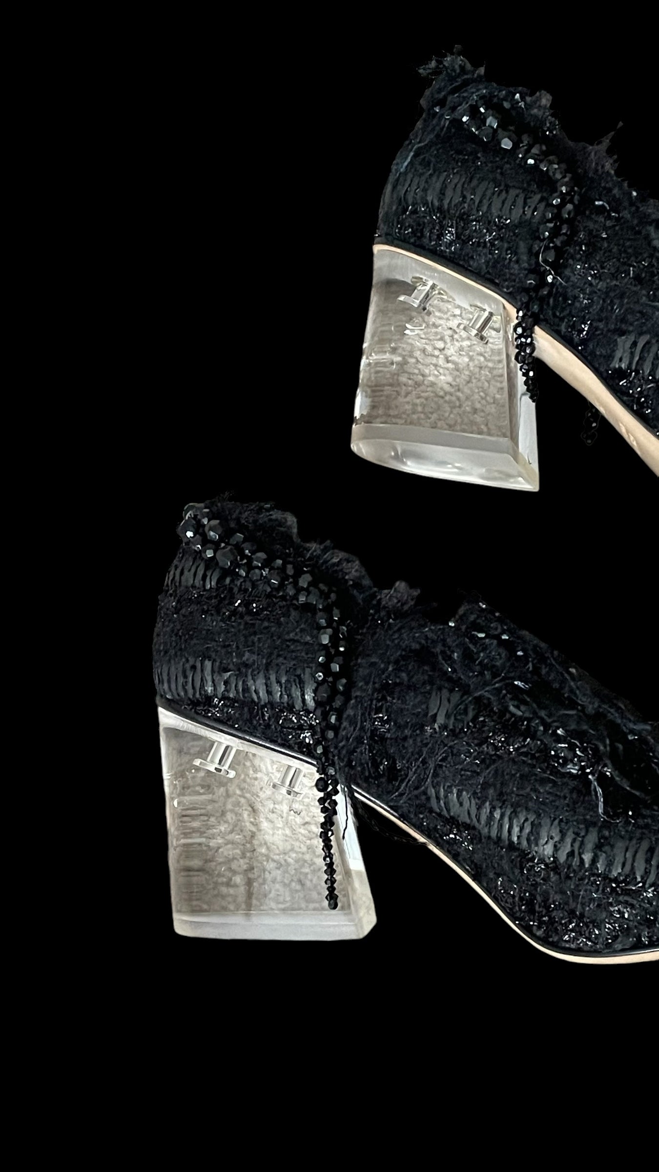 Women’s black embellished tweed block-heel shoes: Leather sole and white transparent block heels. Leather lining.