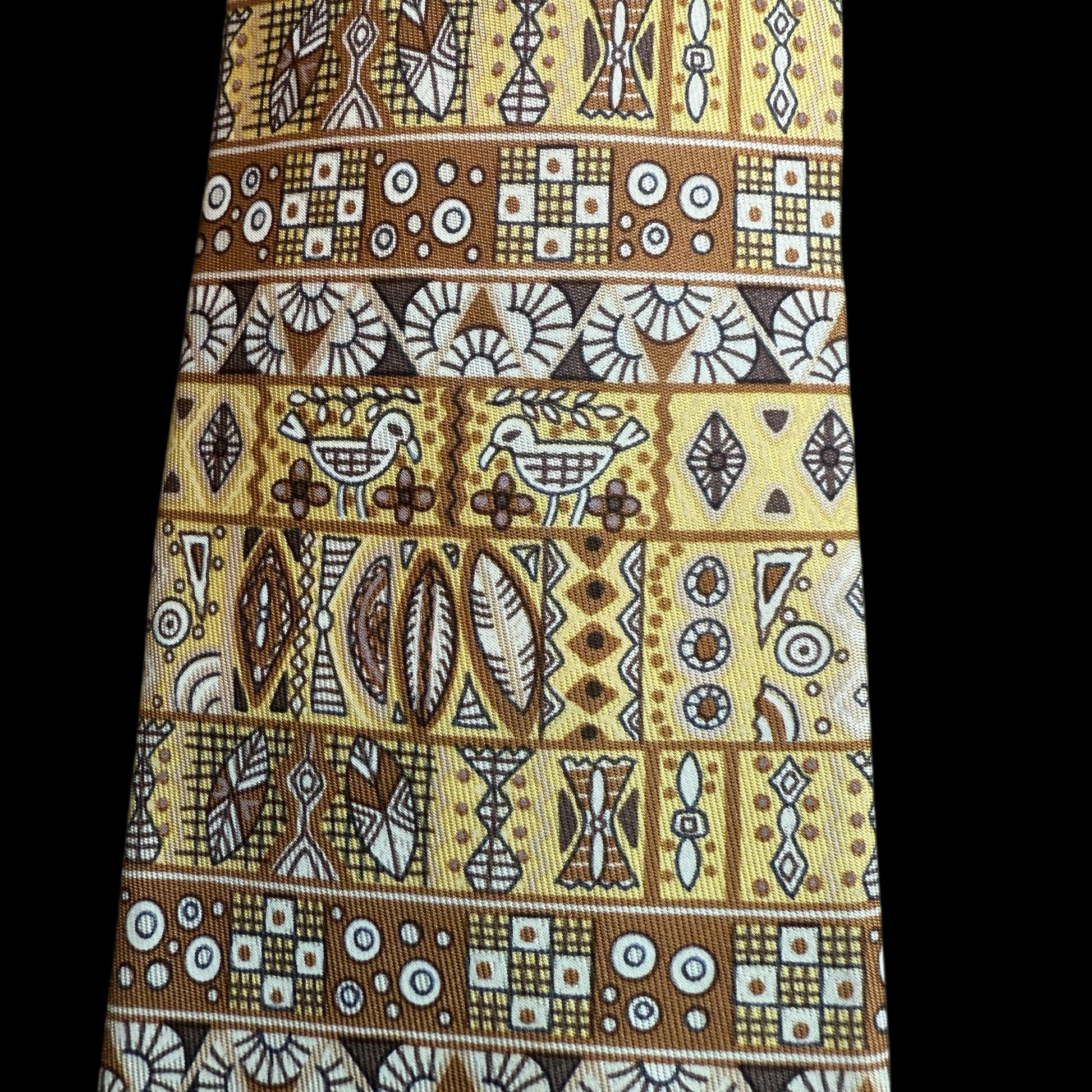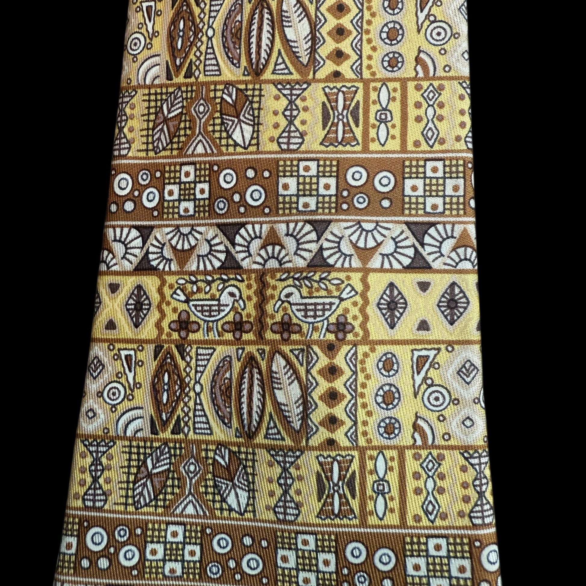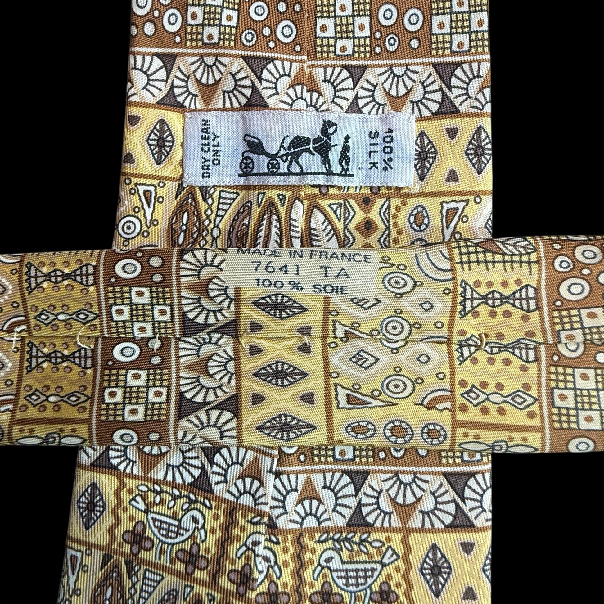 Vintage silk tie by HERMES: yellow with brown, dark brown, white, beige, black, and grey Aztec Egyptian printed.