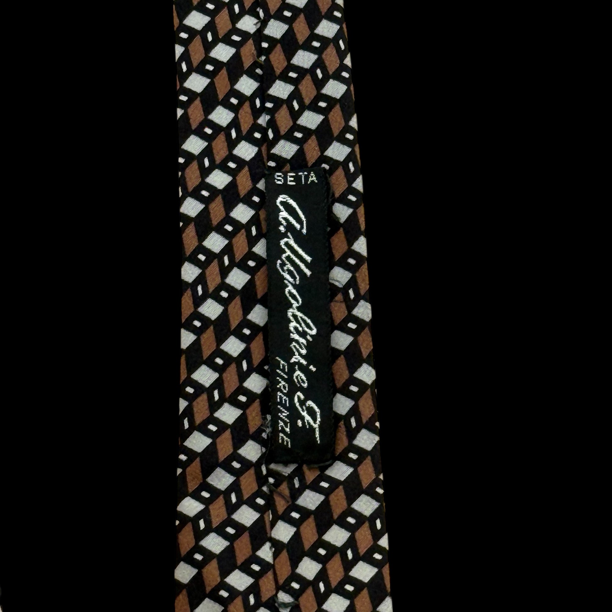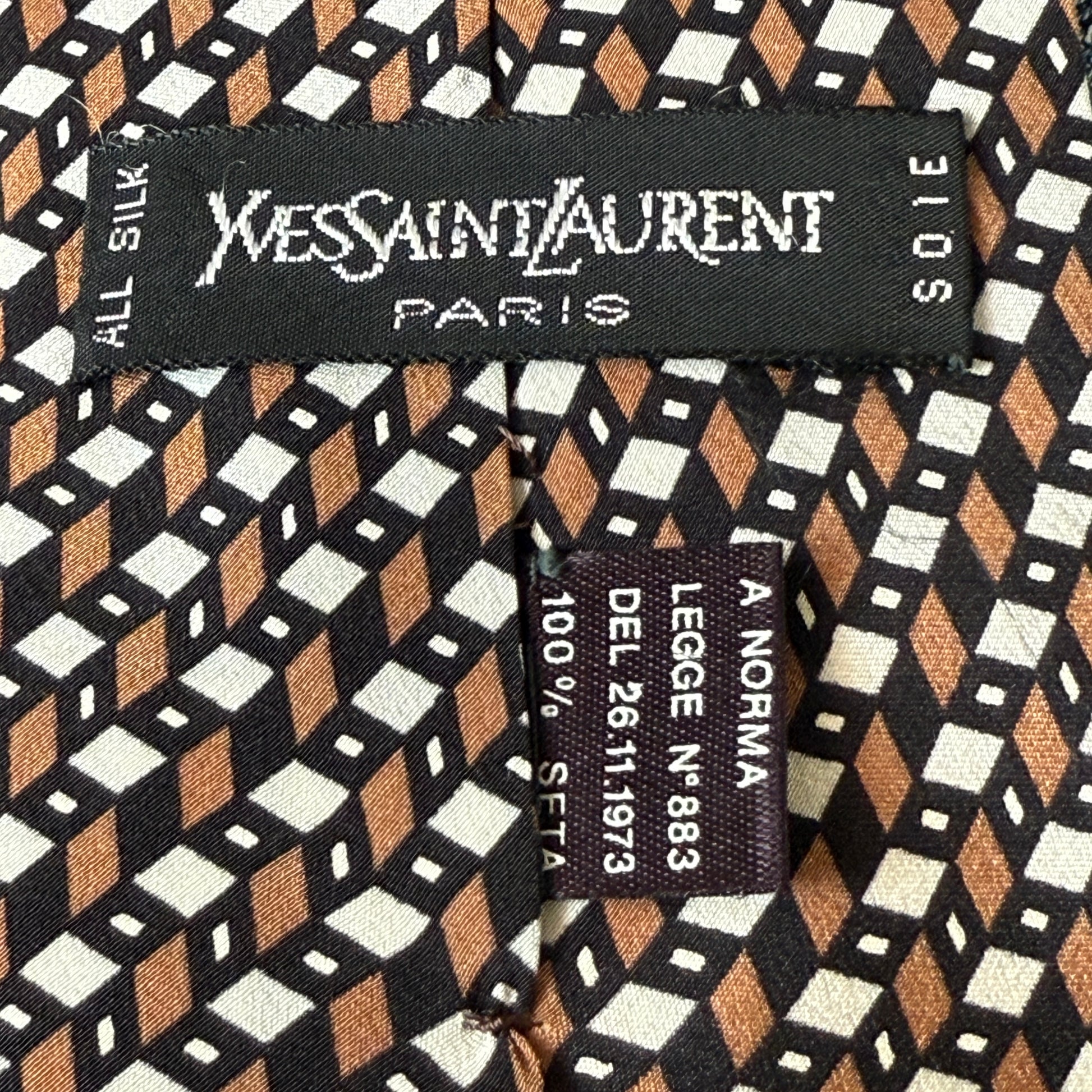 Vintage silk tie by YSL: brown with black, and white geometric design.